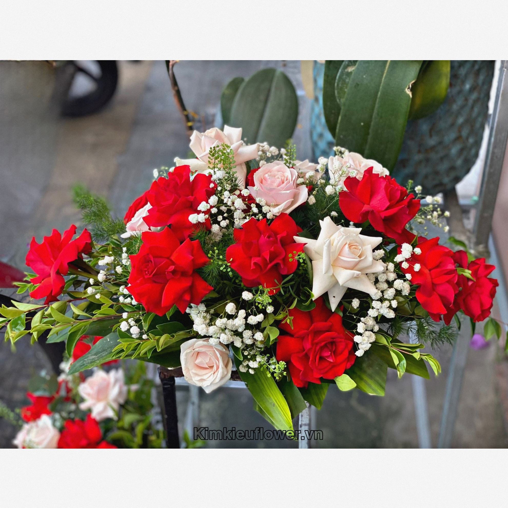 Mẫu DDH20 gồm các loại hoa: + hoa hồng kem + hoa hồng đỏ + và các lá phụ khác - Liên hệ KIM KIỀU FLOWER để tư vấn thiết kế mẫu hoa theo yêu cầu bạn nhé!