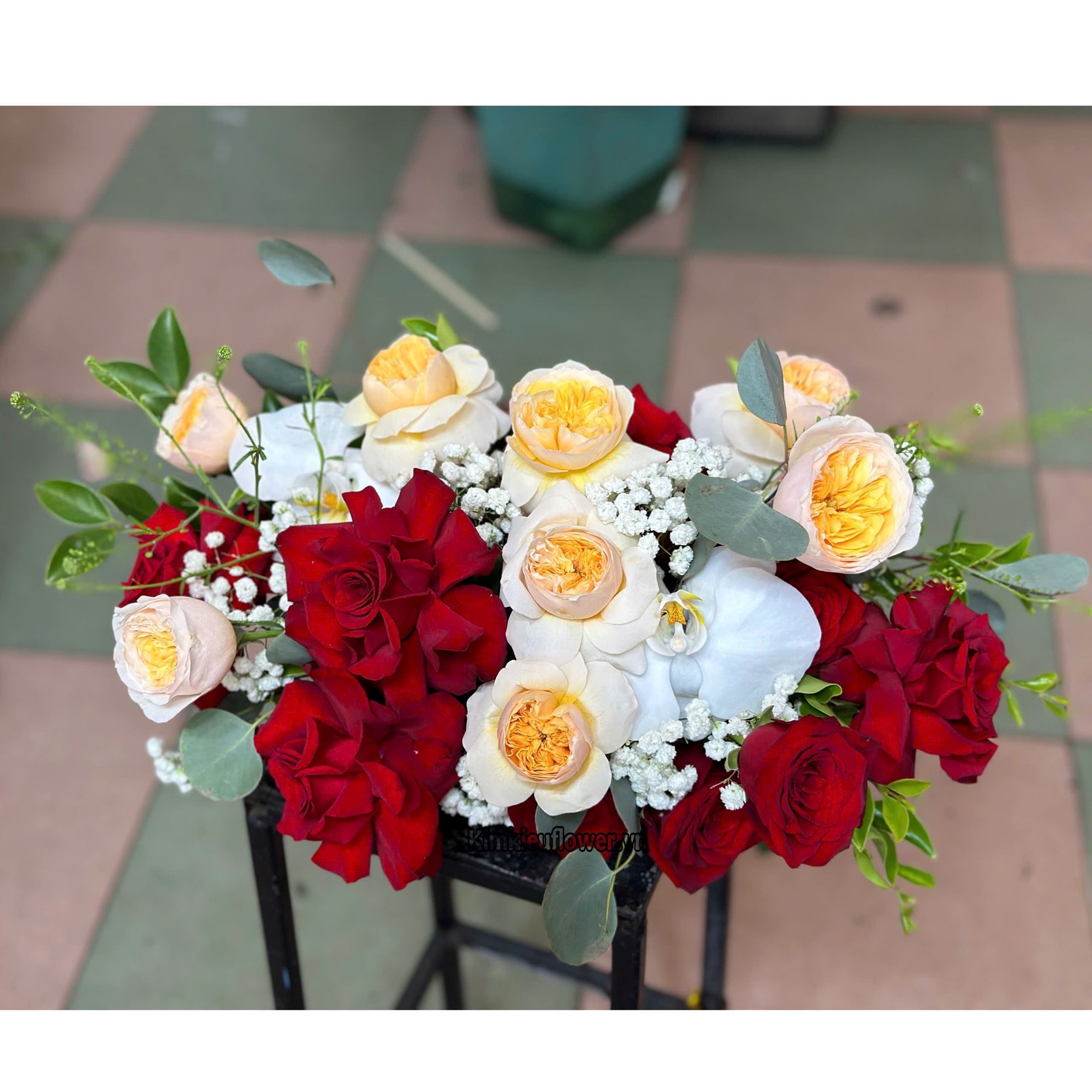 Mẫu ĐH33 gồm các loại hoa: + 9 hoa hồng đỏ + 8 hoa hồng juliet + 2 hồ điệp trắng + và các lá phụ khác - Liên hệ KIM KIỀU FLOWER để tư vấn thiết kế mẫu hoa theo yêu cầu bạn nhé!