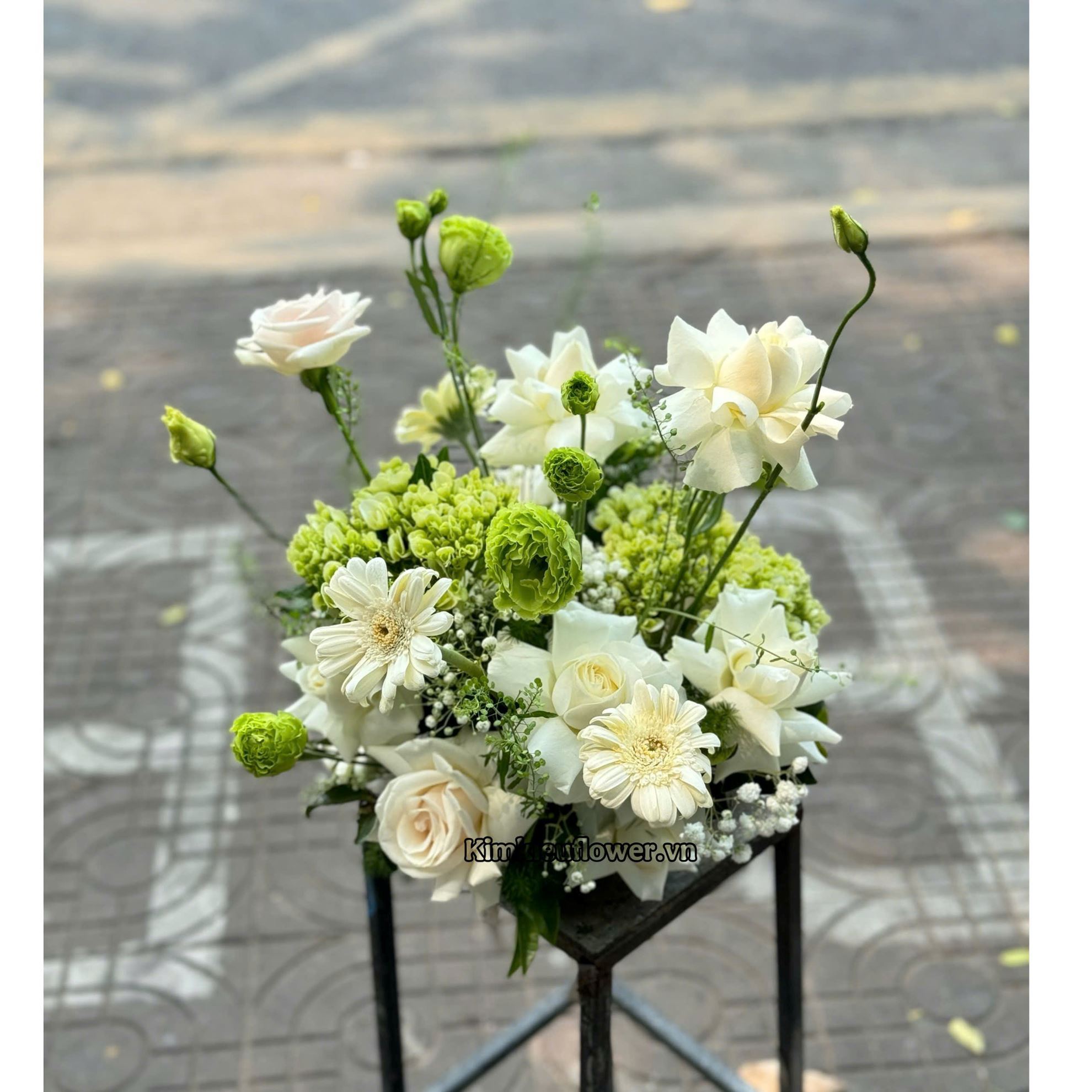 Mẫu ĐH34 gồm các loại hoa: + Cẩm tú cầu + 9 hoa hồng trắng + 3 đồng tiền nhí trắng + cát tường xanh lá + và các lá phụ khác - Liên hệ KIM KIỀU FLOWER để tư vấn thiết kế mẫu hoa theo yêu cầu bạn nhé!