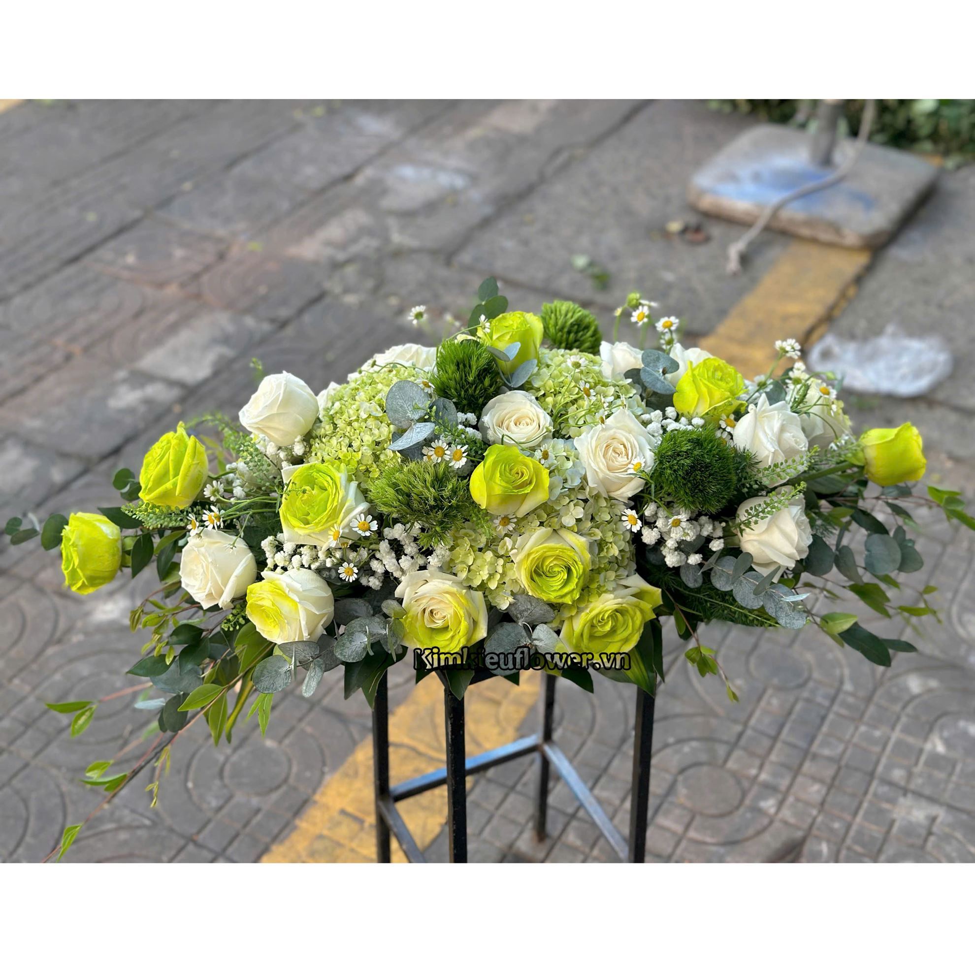 Mẫu ĐH42 gồm các loại hoa: + Cẩm tú cầu xanh lá + Hoa hồng trắng + Hoa hồng trắng xịt màu + green whicky + và các lá phụ khác - Liên hệ KIM KIỀU FLOWER để tư vấn thiết kế mẫu hoa theo yêu cầu bạn nhé!