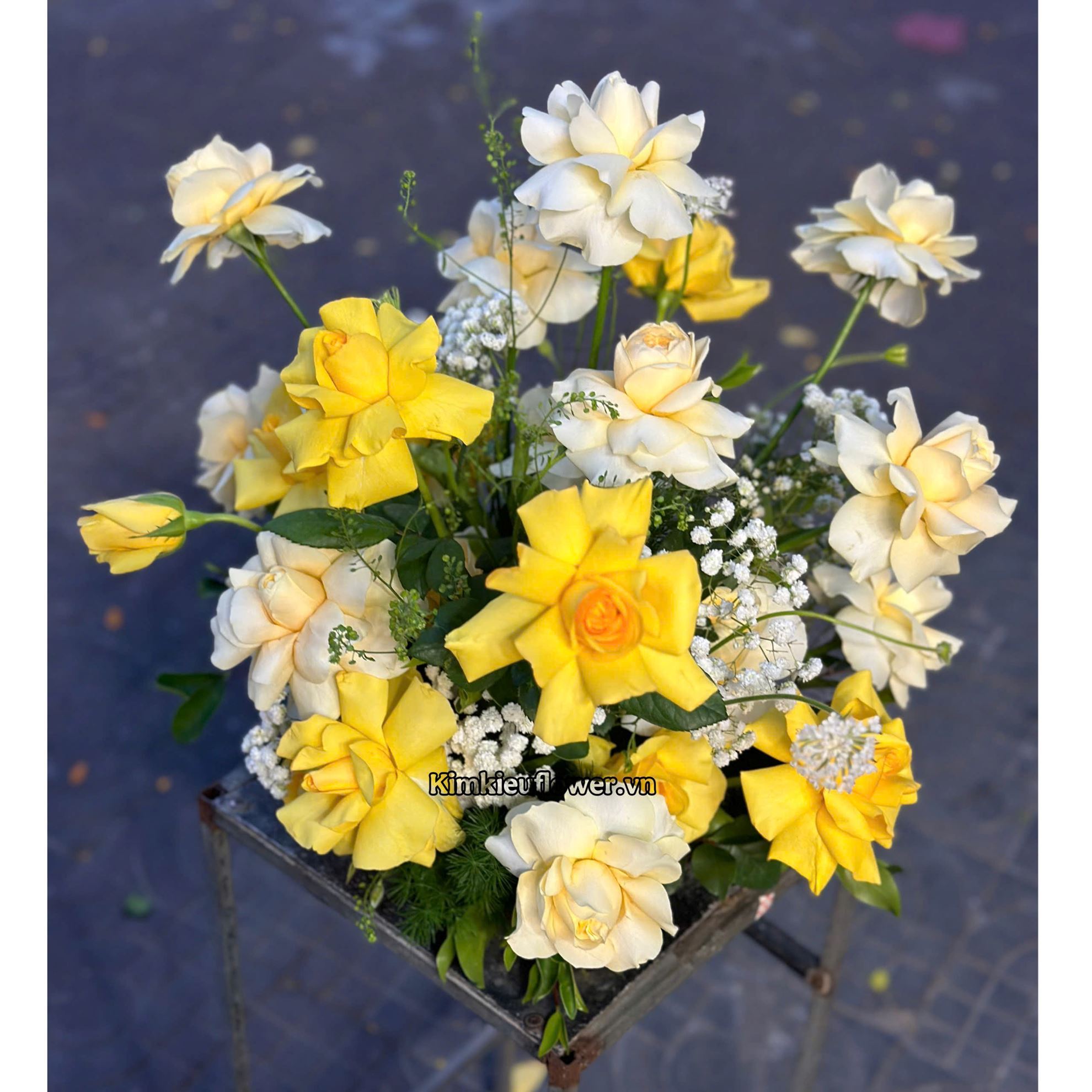 Mẫu ĐH41 gồm các loại hoa: + 14 victo vàng + 8 hoa hồng vàng + và các lá phụ khác - Liên hệ KIM KIỀU FLOWER để tư vấn thiết kế mẫu hoa theo yêu cầu bạn nhé!