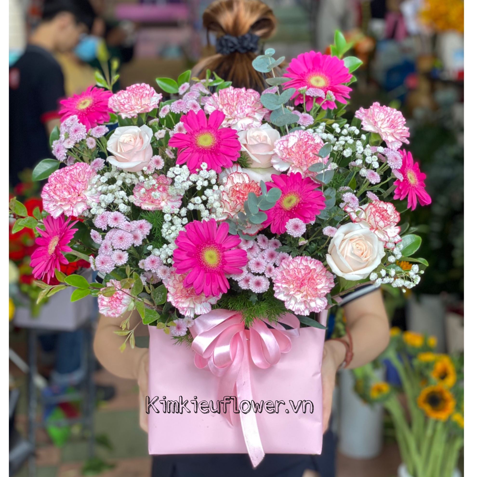 Giỏ hoa cẩm chướng hồng, hoa hồng - HG419