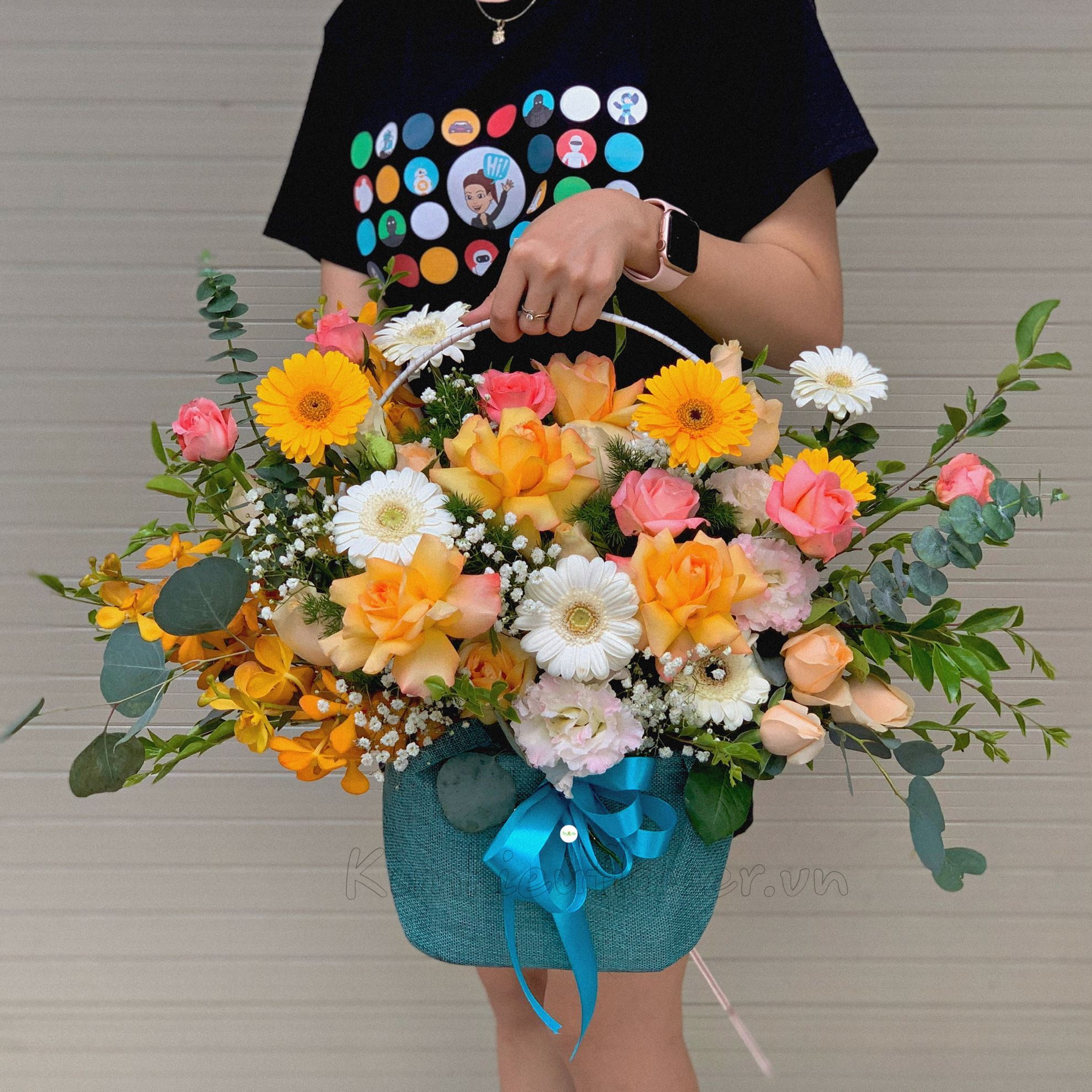 Mẫu HG252 gồm các loại hoa: + hoa hồng cam + đồng tiền nhí + và các hoa,lá phụ khác- Liên hệ KIM KIỀU FLOWER để tư vấn thiết kế mẫu hoa theo yêu cầu bạn nhé!