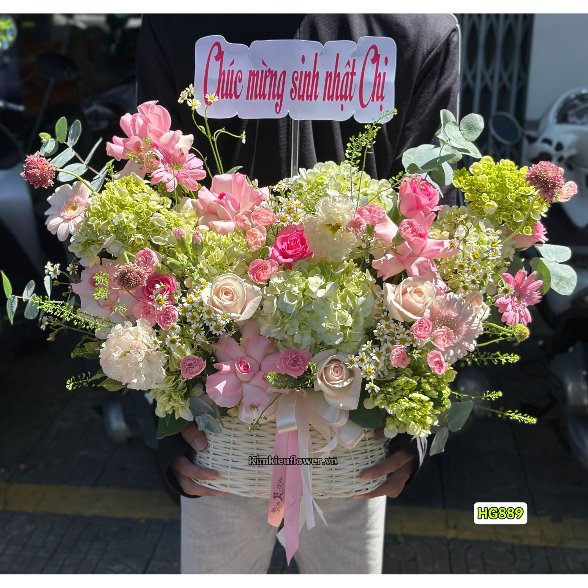 giỏ hoa cẩm tú cầu, mix hoa hồng - HG889