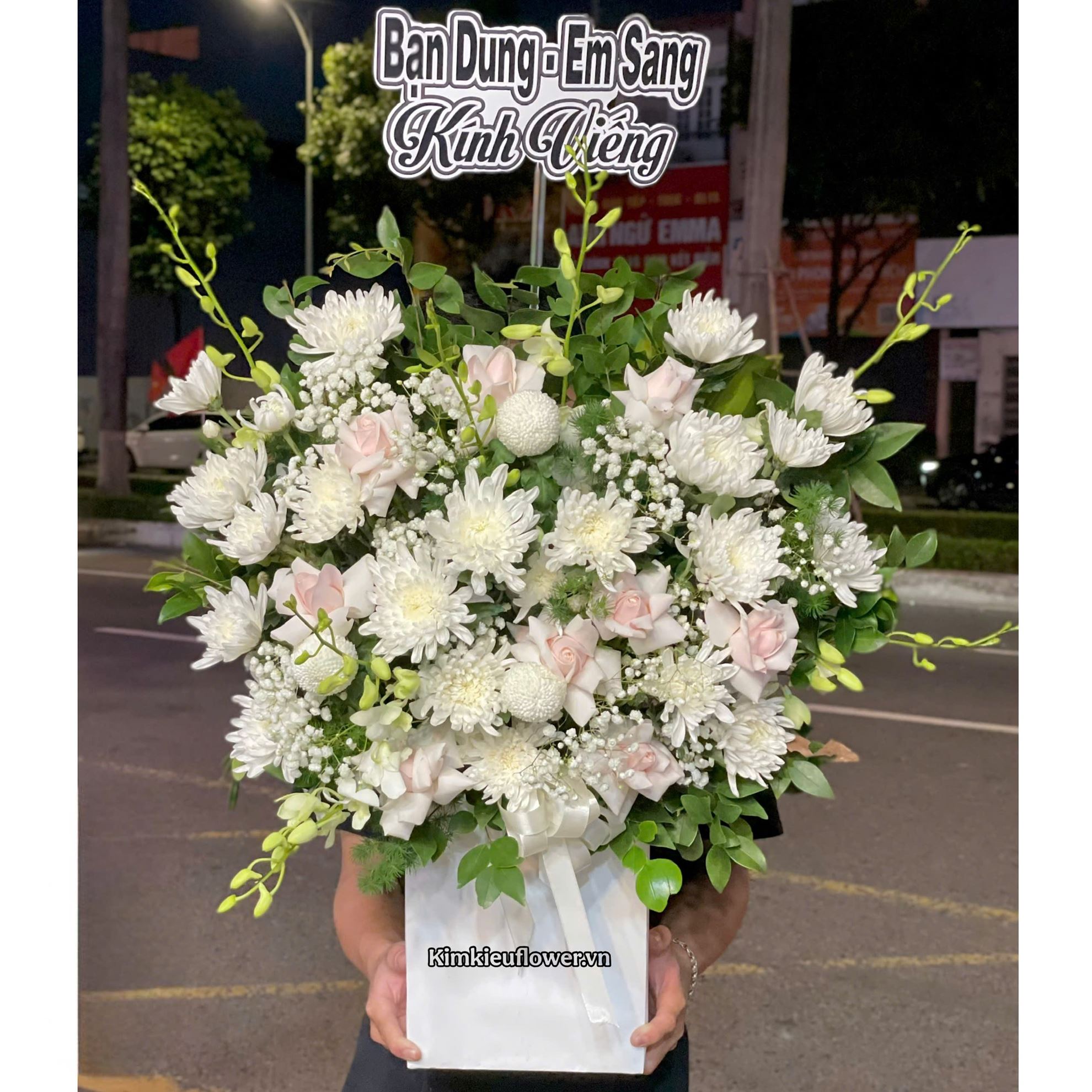 Giỏ hoa chia buồn tone trắng hồng mix cúc pingpong - GV23