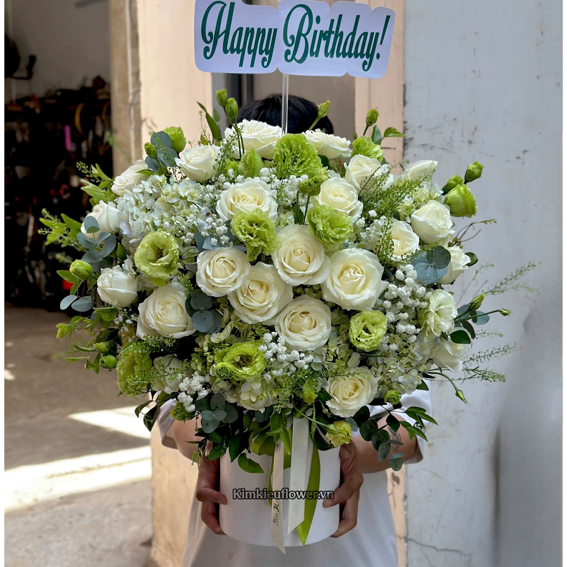 Mẫu HG933 gồm các loại hoa: + 22 hồng trắng + 4 cẩm tú cầu + 12 cành cát tường xanh + và các lá phụ khác - Liên hệ KIM KIỀU FLOWER để tư vấn thiết kế mẫu hoa theo yêu cầu bạn nhé!