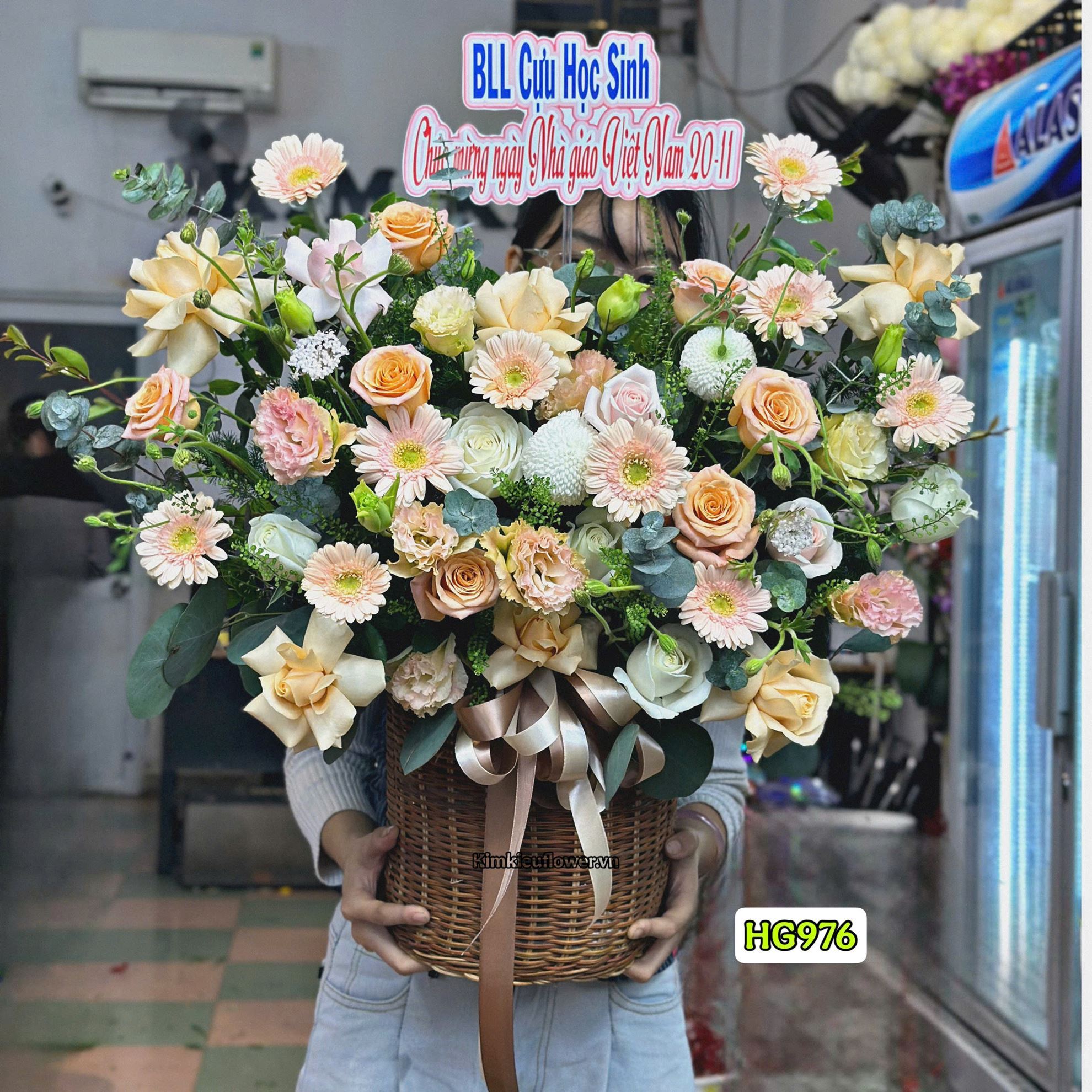 Mẫu HG976 gồm các loại hoa: + 6 hồng mỡ gà + 5 hoa hồng trắng + 2 hoa hồng kem + 7 shimmer + 10 đồng tiền carot + 6 cát tường chùm + 2 cúc pingpong + và các lá phụ khác - Liên hệ KIM KIỀU FLOWER để tư vấn thiết kế mẫu hoa theo yêu cầu bạn nhé!