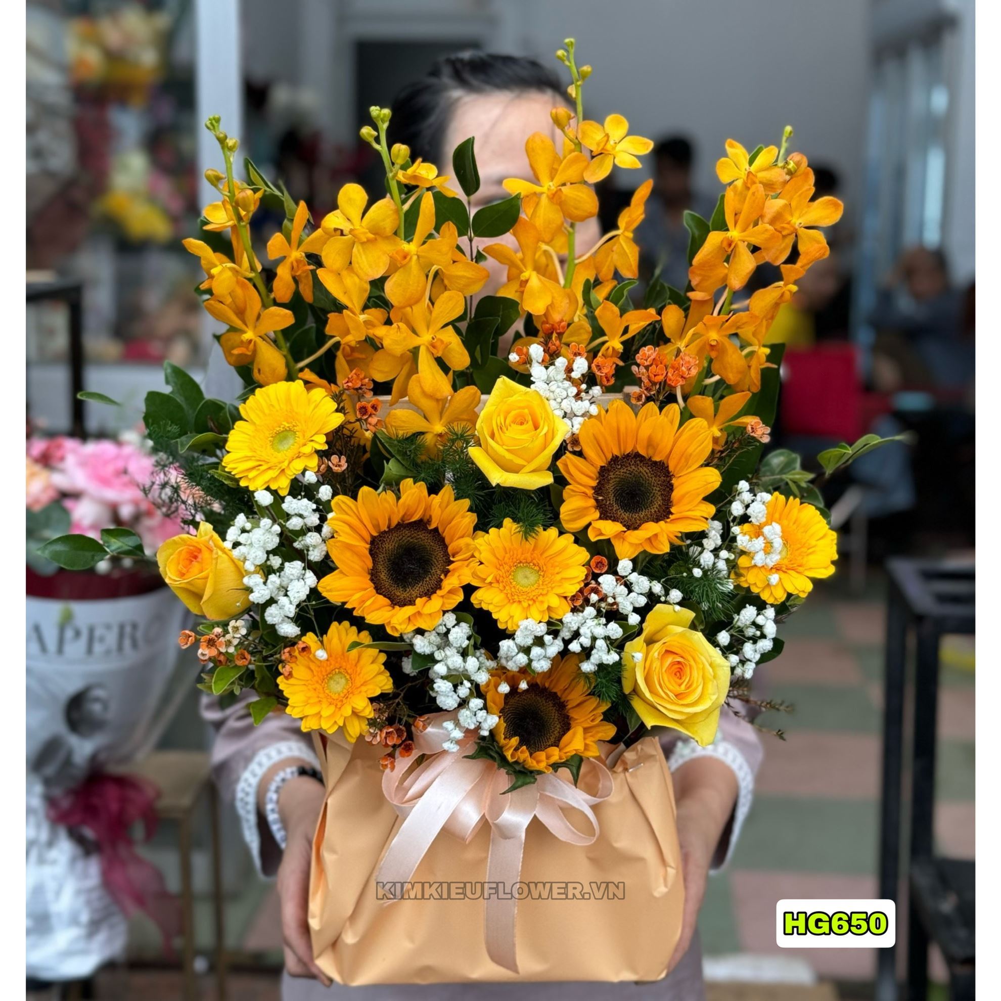Mẫu HG650 gồm các loại hoa: + hoa hướng dương + hoa hồng vàng + và các hoa, lá phụ khác - Liên hệ KIM KIỀU FLOWER để tư vấn thiết kế mẫu hoa theo yêu cầu bạn nhé!