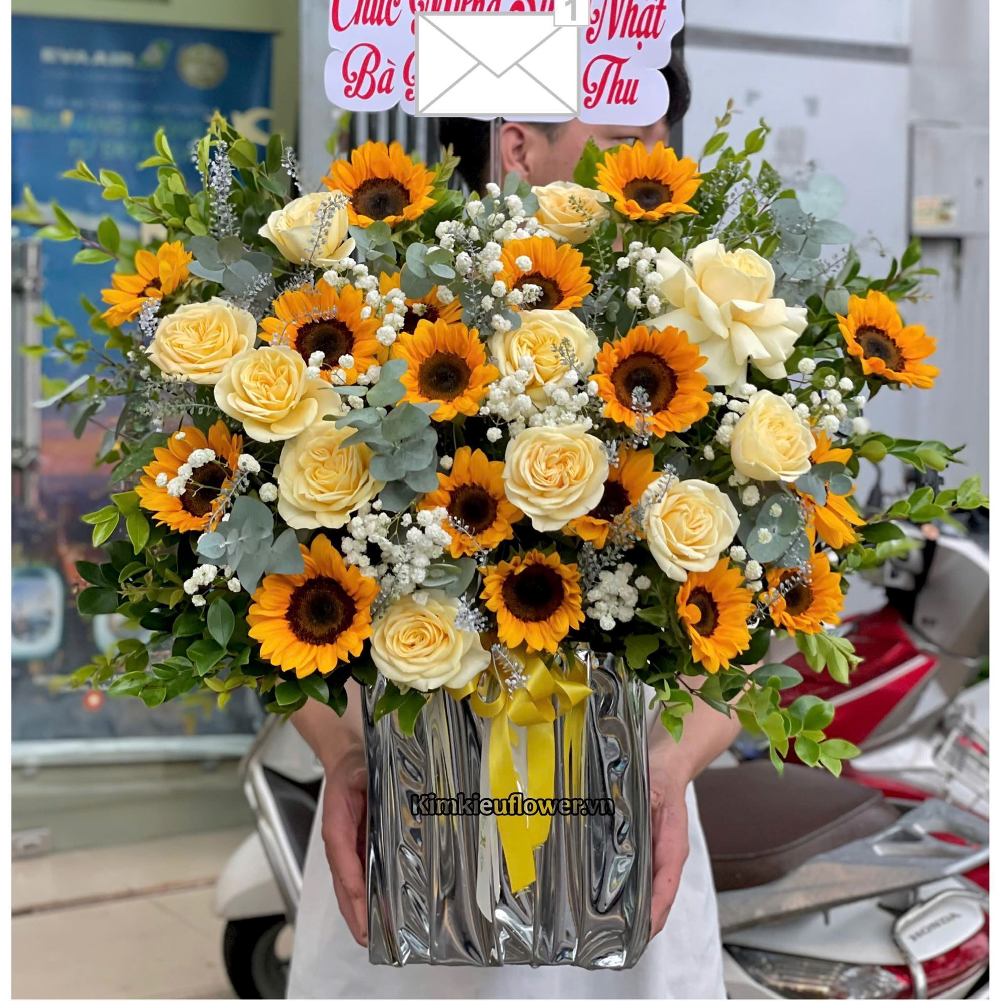 Mẫu HG957 gồm các loại hoa: + 11 victo vàng + 18 hướng dương + và các lá phụ khác - Liên hệ KIM KIỀU FLOWER để tư vấn thiết kế mẫu hoa theo yêu cầu bạn nhé!