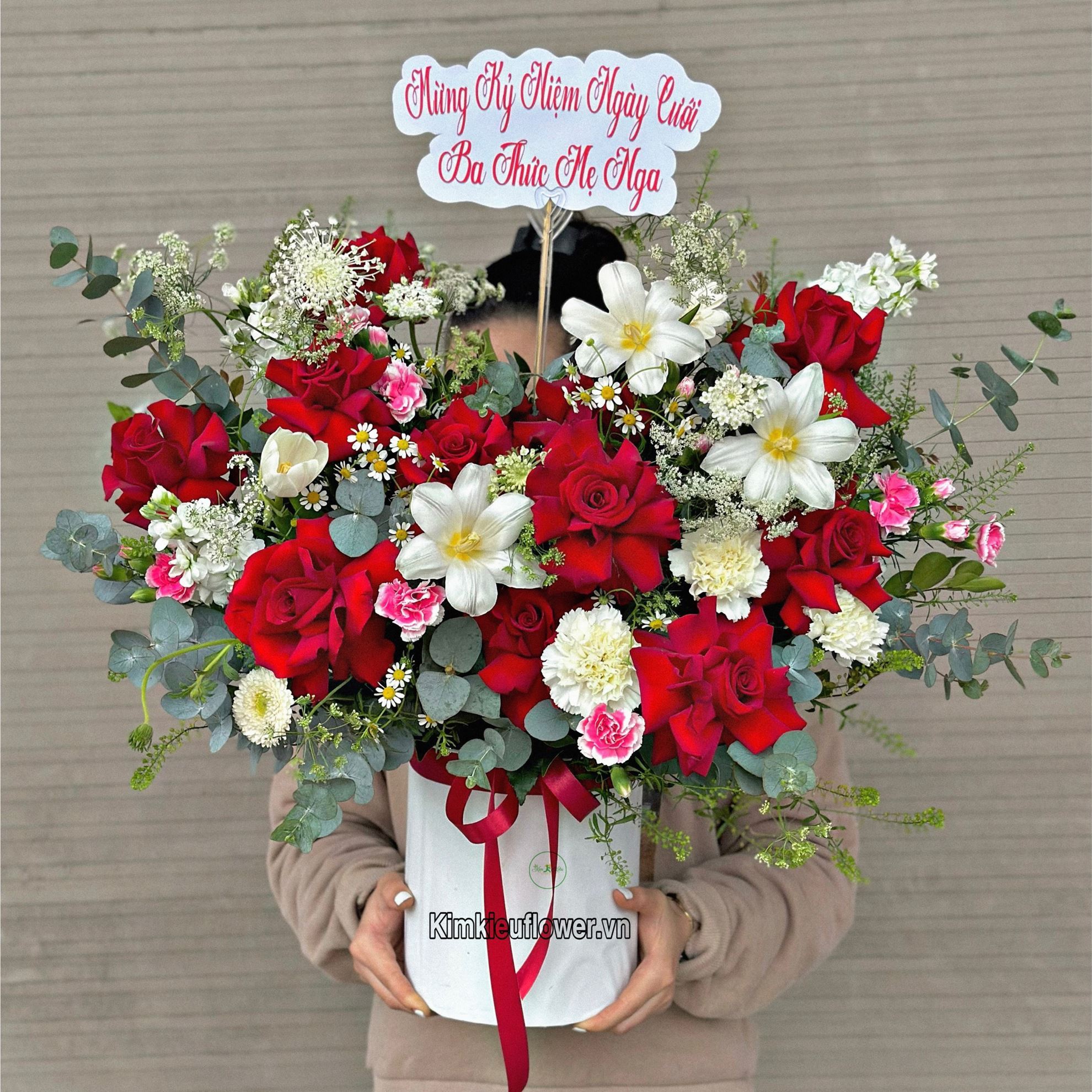 Mẫu HG643 gồm các loại hoa: + 3 phi yến trắng + 11 hoa hồng đỏ eku + 4 hoa tulip nhập khẩu Hà Lan + hoa cẩm chướng trắng, hồng + 2 đồng tiền trắng + và các hoa, lá phụ khác - Liên hệ KIM KIỀU FLOWER để tư vấn thiết kế mẫu hoa theo yêu cầu bạn nhé!