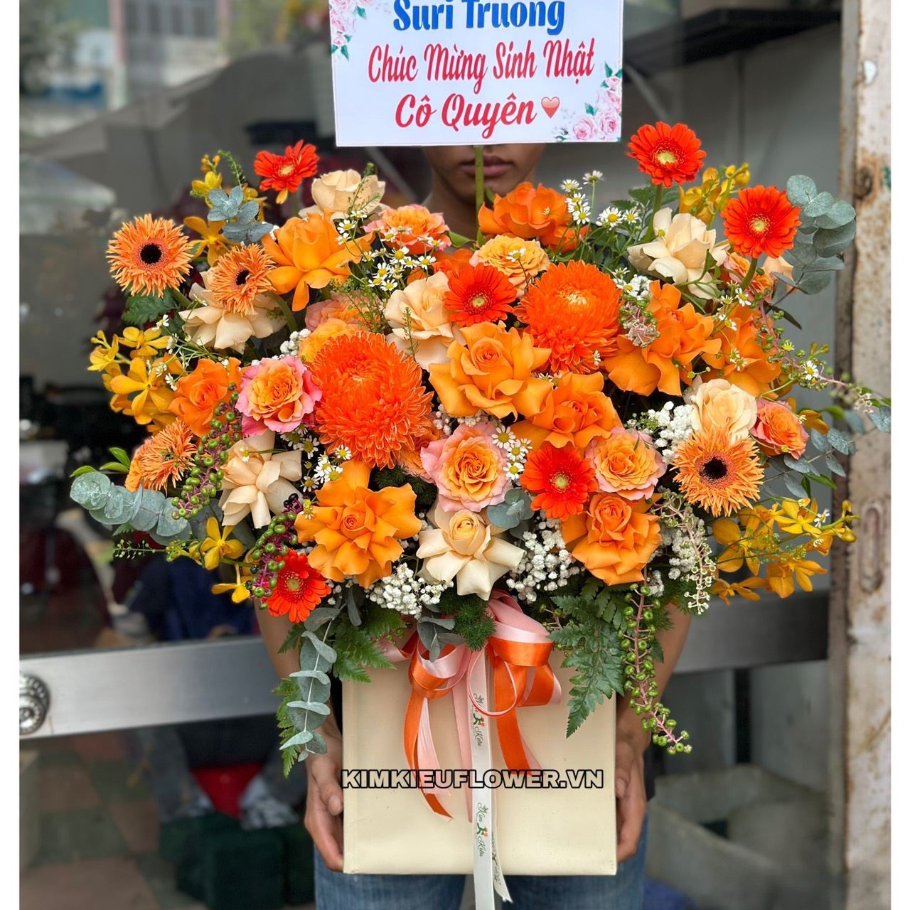 Giỏ hoa HG715 gồm: + 2 cúc mẫu đơn cam + 10 hoa hồng cam quốc vương lận cánh + 8 hoa hồng mỡ gà lận cánh + 9 hoa hồng cam spirit + 6 đồng tiền nhí cam + 4 đồng tiền tua + 6 lan vàng + và các lá phụ khác - Liên hệ KIM KIỀU FLOWER để tư vấn thiết kế mẫu hoa theo yêu cầu bạn nhé!