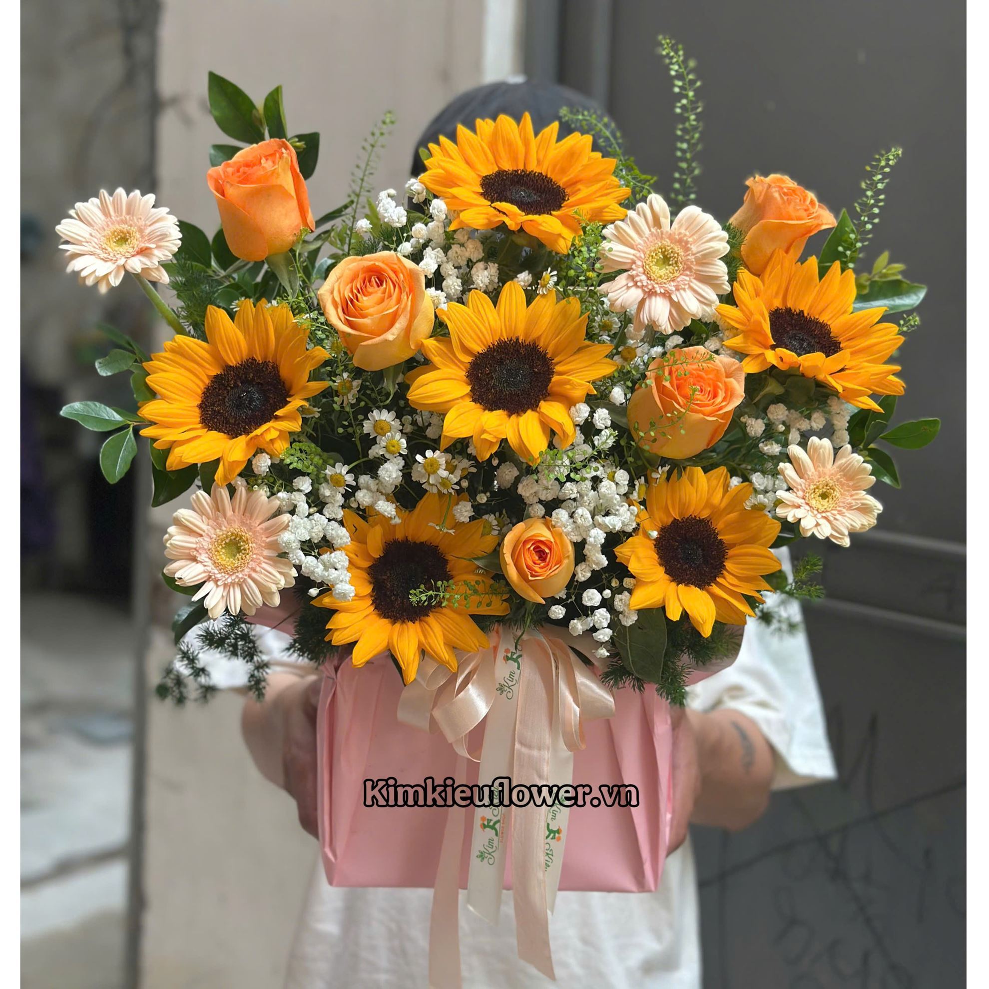 Mẫu HG807 gồm các loại hoa: + 6 Hoa hướng dương + 5 Hoa hồng cam quốc vương + 4 Đồng tiền nhí màu cà rốt + và các lá phụ khác - Liên hệ KIM KIỀU FLOWER để tư vấn thiết kế mẫu hoa theo yêu cầu bạn nhé!