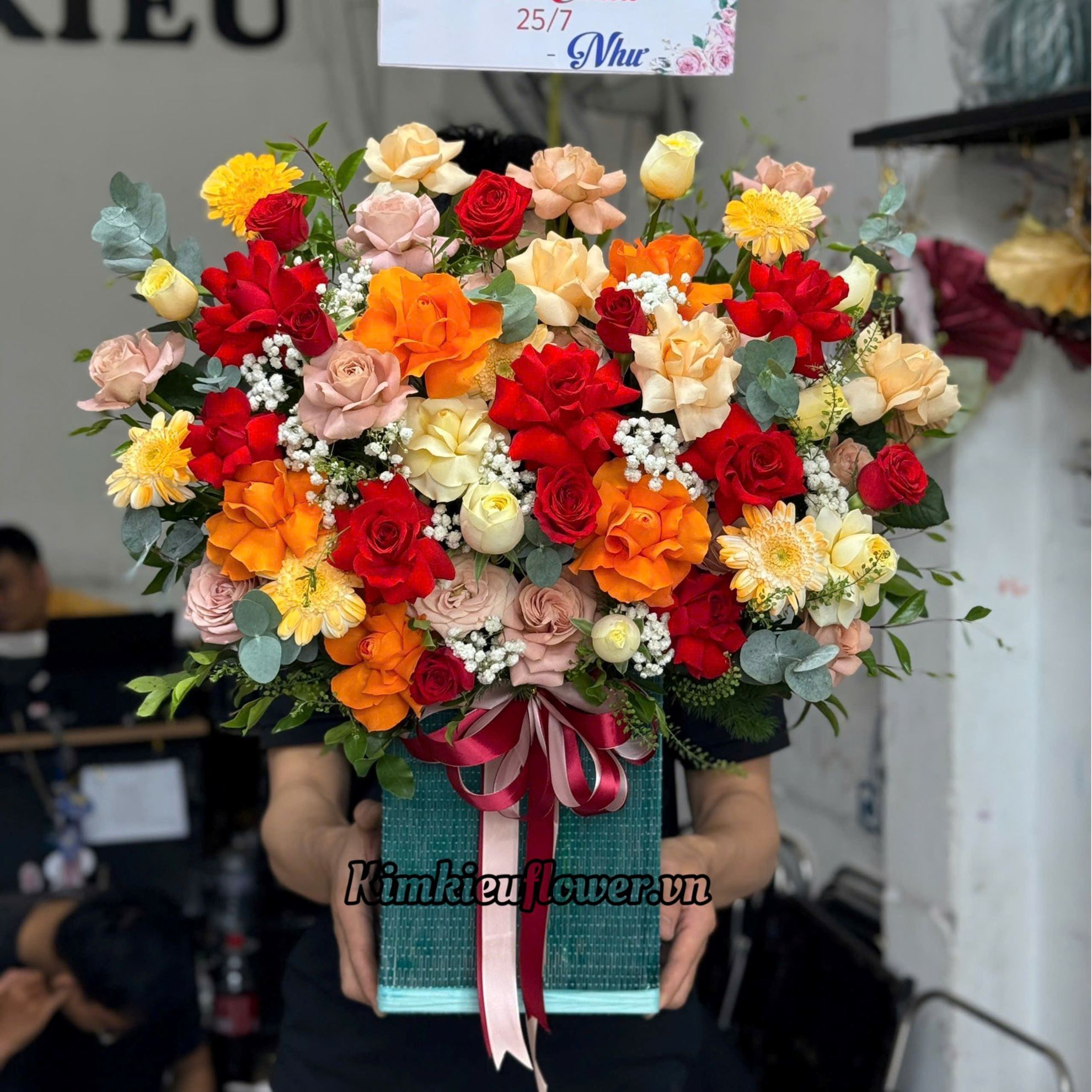 Mẫu HG736 gồm các loại hoa: + 13 hoa hồng đỏ ( 7 lận - 6 không lận ) + 5 hoa hồng cam lận cánh + 4 hồng mỡ gà lận cánh + 8 hoa victo vàng ( 6 không lận, 2 lận ) + 9 hoa hồng capuchino lận cánh + 5 đồng tiền nhí + và các lá phụ khác - Liên hệ KIM KIỀU FLOWER để tư vấn thiết kế mẫu hoa theo yêu cầu bạn nhé!