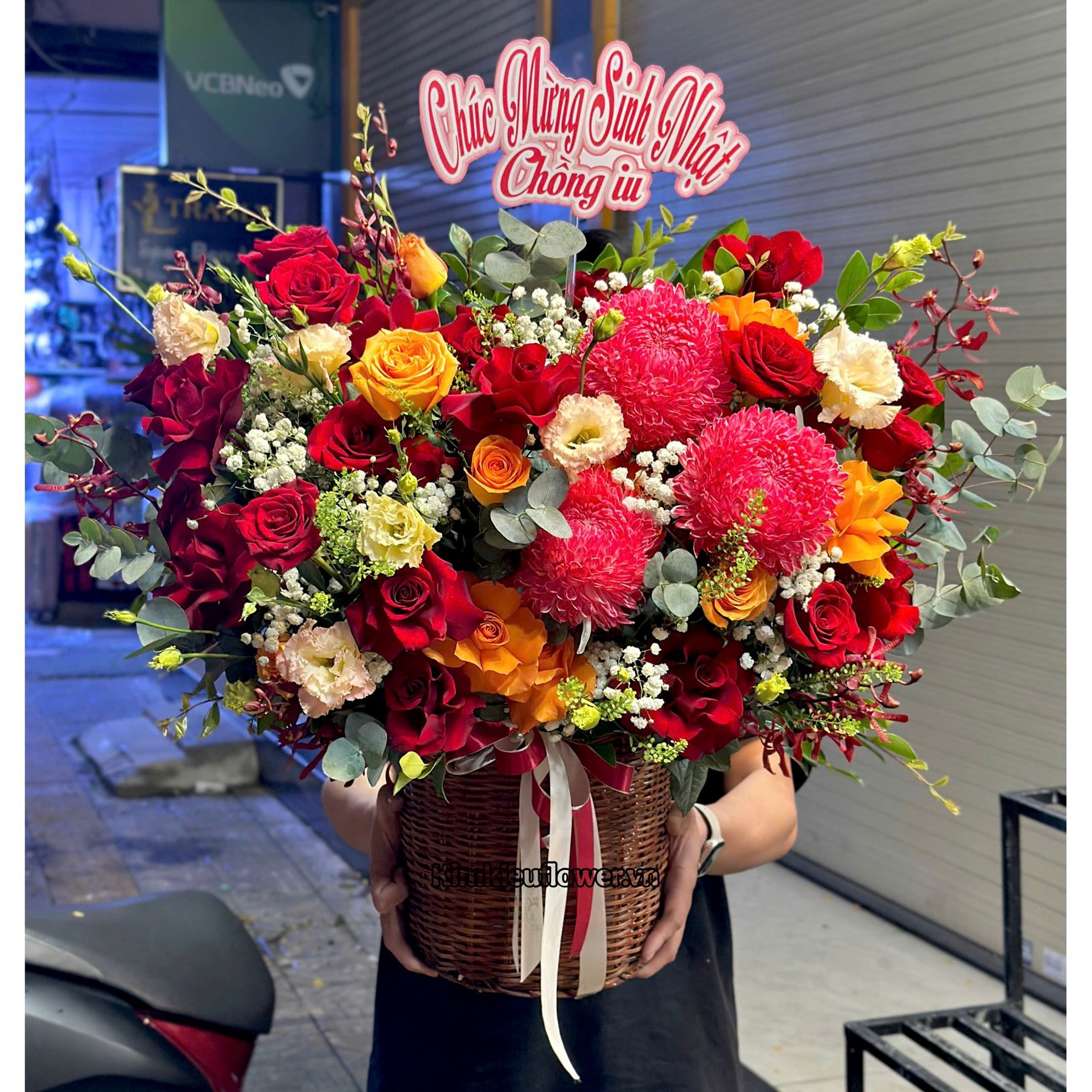 Giỏ hoa chúc mừng tone đỏ cam mix cúc mẫu đơn - HG949
