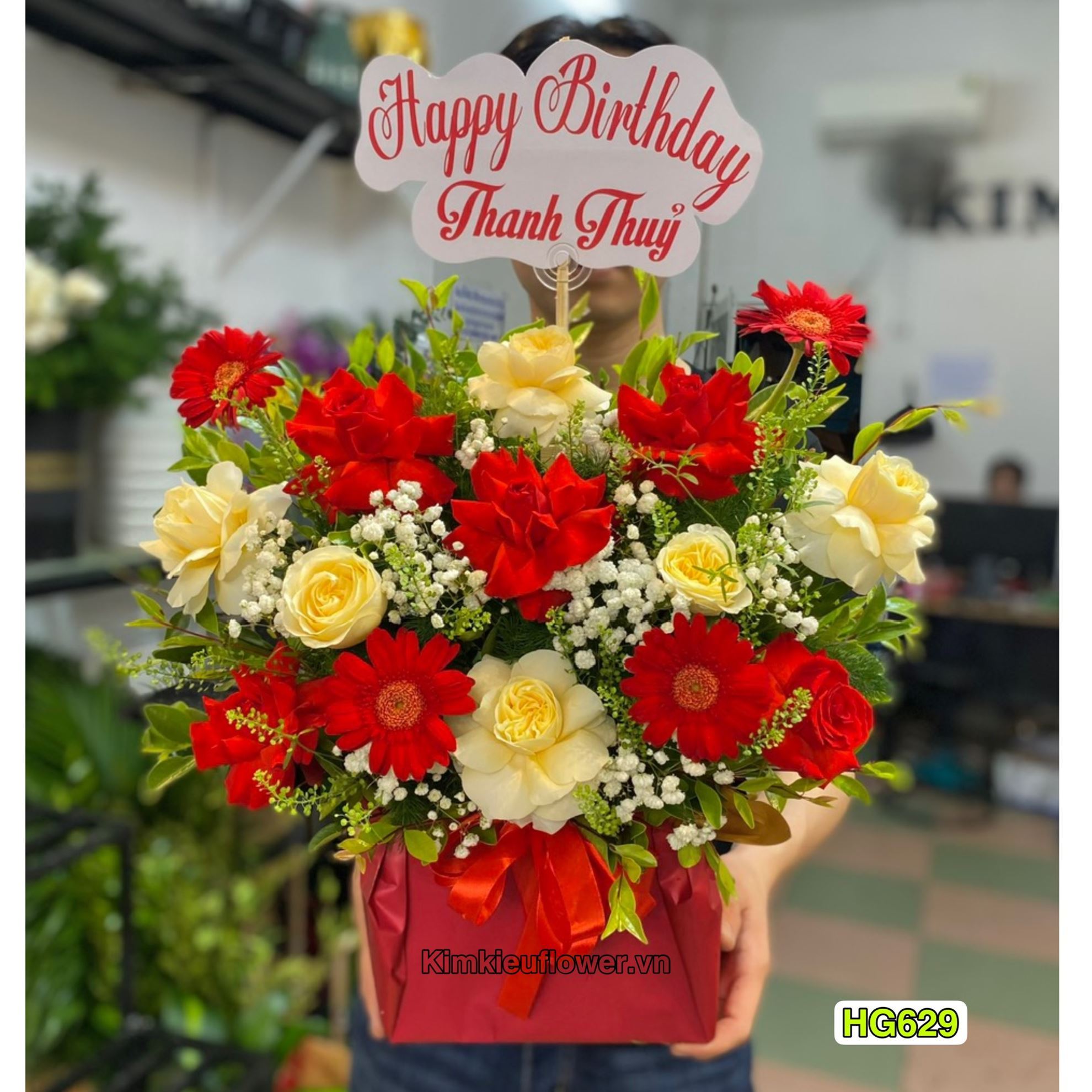 Mẫu HG629 gồm các loại hoa: + 5 hoa hồng đỏ pháp lận + 6 hoa hồng victo ( 4 lận, 2 không lận ) + 4 đồng tiền nhí + và các lá phụ khác - Liên hệ KIM KIỀU FLOWER để tư vấn thiết kế mẫu hoa theo yêu cầu bạn nhé!