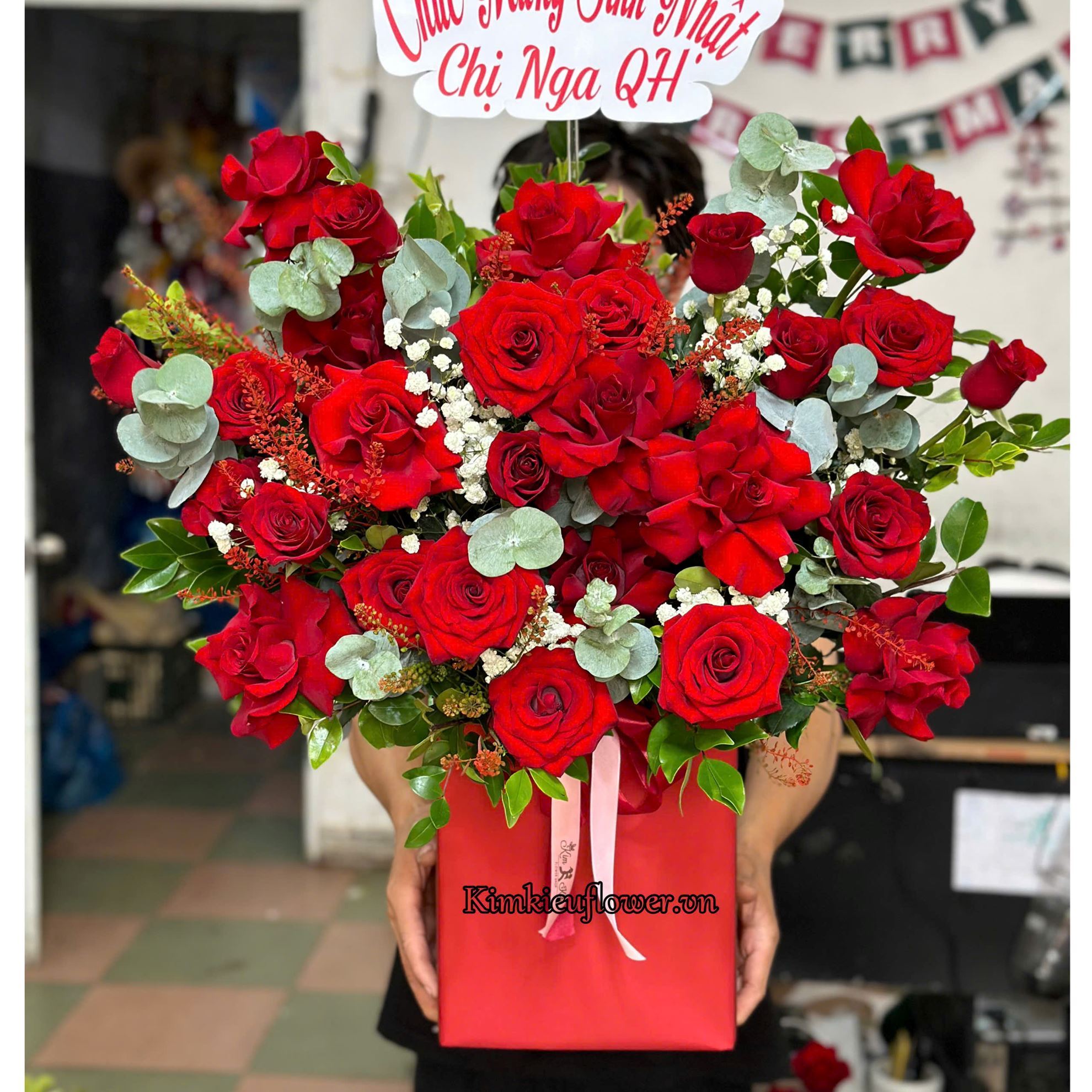 Mẫu HG777 gồm các loại hoa: + 26 Hoa hồng đỏ ekudor( 10 lận, 16 không lận ) + và các lá phụ khác - Liên hệ KIM KIỀU FLOWER để tư vấn thiết kế mẫu hoa theo yêu cầu bạn nhé!