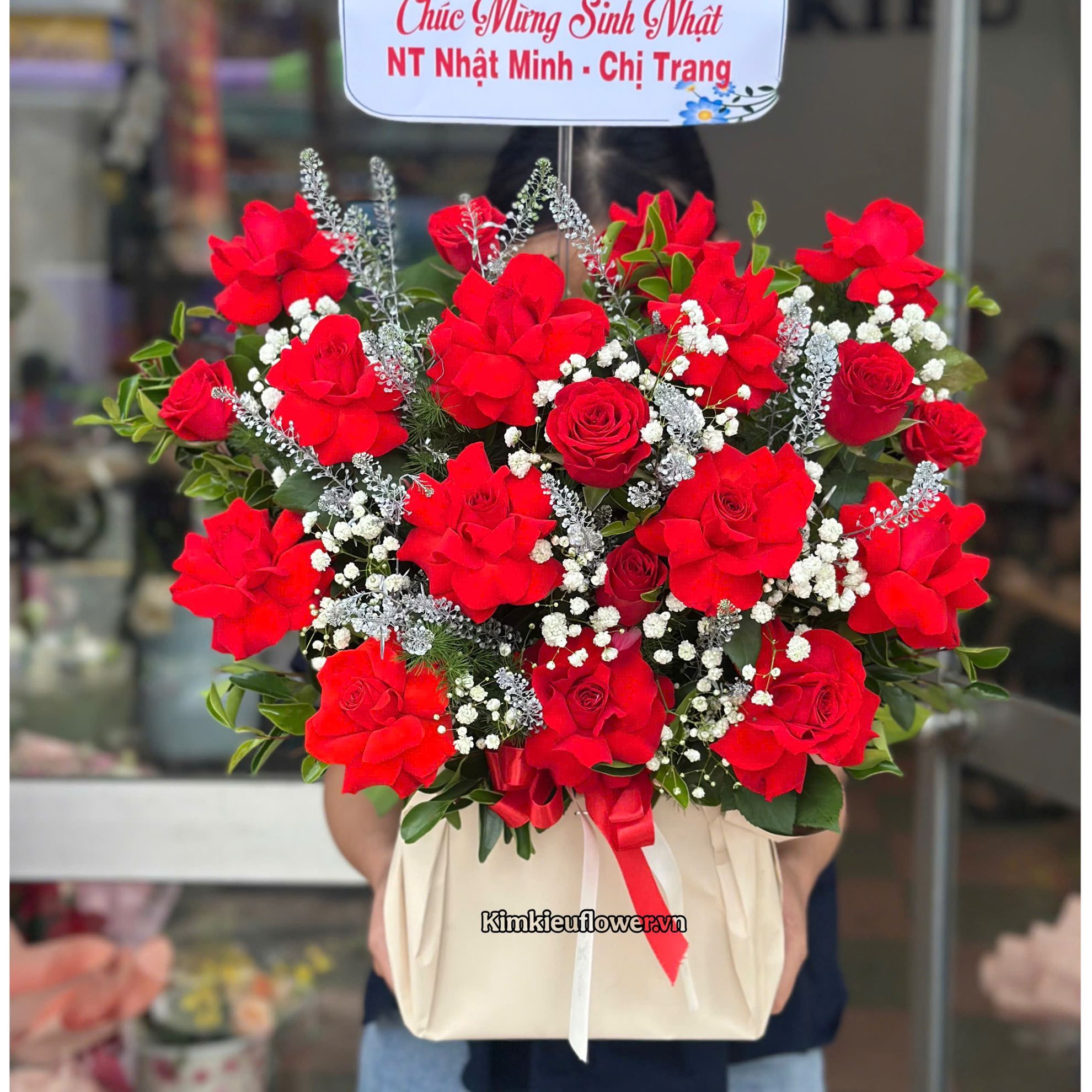 Mẫu HG945 gồm các loại hoa: + 13 hồng đỏ pháp lận cánh, 6 k lận + và các lá phụ khác - Liên hệ KIM KIỀU FLOWER để tư vấn thiết kế mẫu hoa theo yêu cầu bạn nhé!