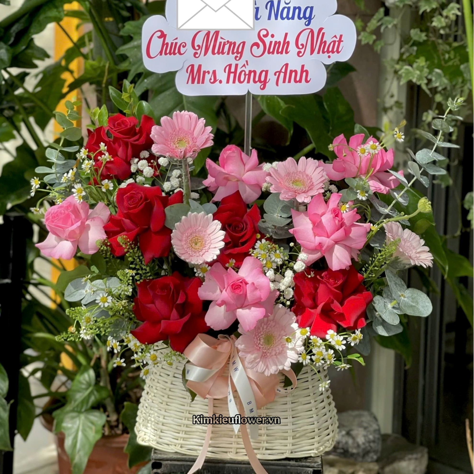 Giỏ hoa chúc mừng tone đỏ hồng mix lá bạc - HG1042