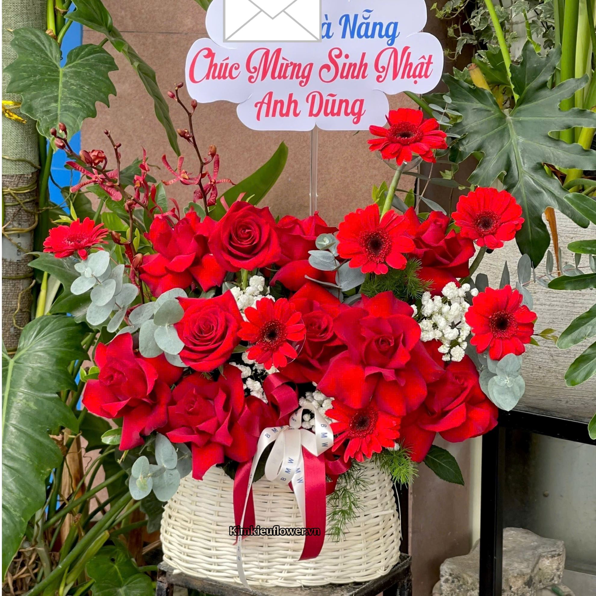 Giỏ hoa chúc mừng tone đỏ mix lá bạc - HG1053