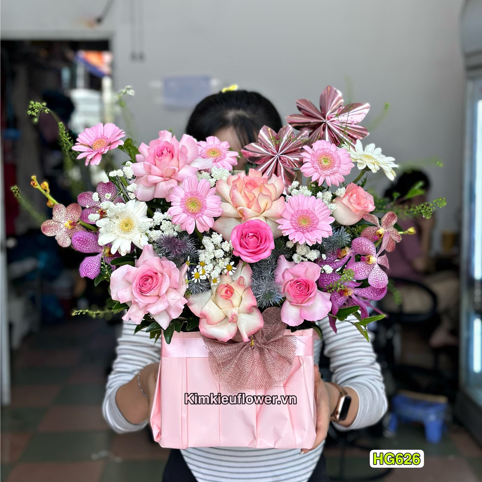 Mẫu HG626 gồm các loại hoa: + 3 hoa hồng hỷ viền ( 2 lận - 1 không lận ) + 3 lạc thần lận + 1 hồng dâu + 4 đồng tiền nhí dâu, 2 đồng tiền nhí trắng + 2 lan tím + cúc tana + và các hoa, lá phụ khác - Liên hệ KIM KIỀU FLOWER để tư vấn thiết kế mẫu hoa theo yêu cầu bạn nhé!