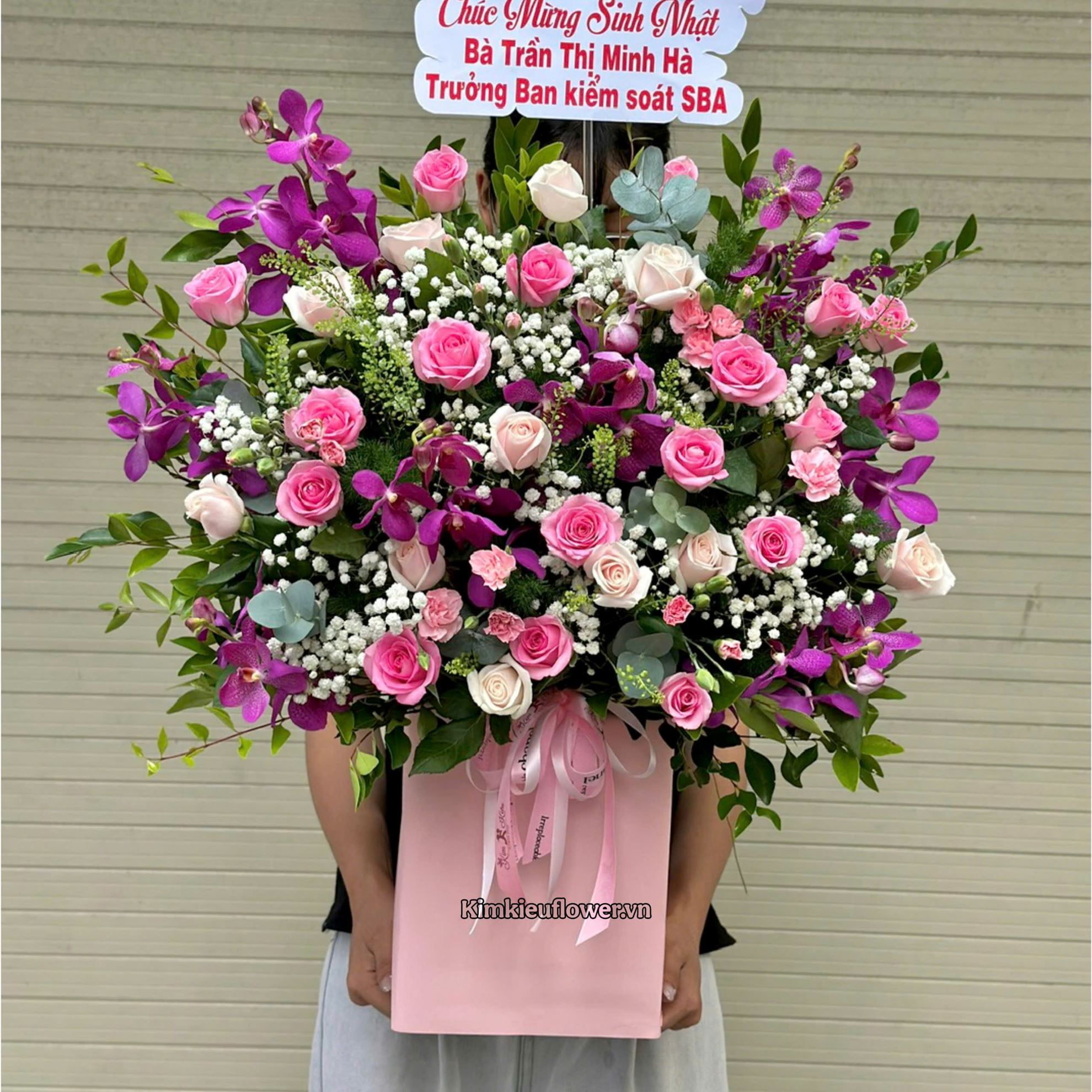 Giỏ hoa chúc mừng tone hồng mix lan tím - HG926