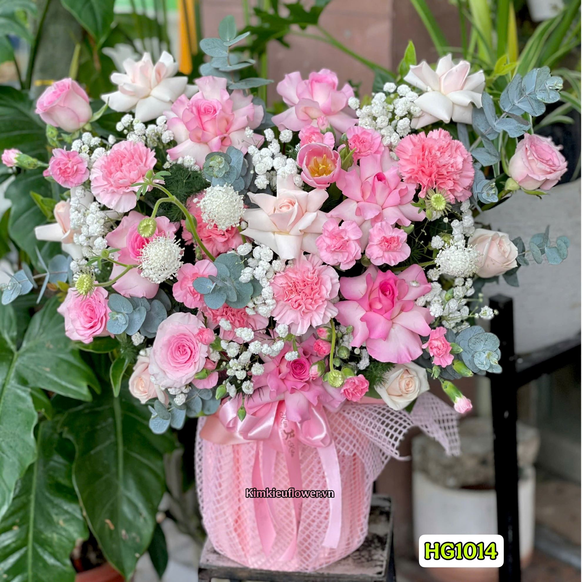 Mẫu HG1014 gồm các loại hoa: + 8 hoa hồng lạc thần + 2 hoa hồng dâu + 7 hoa hồng kem + 1 tulip hồng + 6 cành cẩm chướng hồng + 4 cẩm chướng đơn + và các lá phụ khác - Liên hệ KIM KIỀU FLOWER để tư vấn thiết kế mẫu hoa theo yêu cầu bạn nhé!