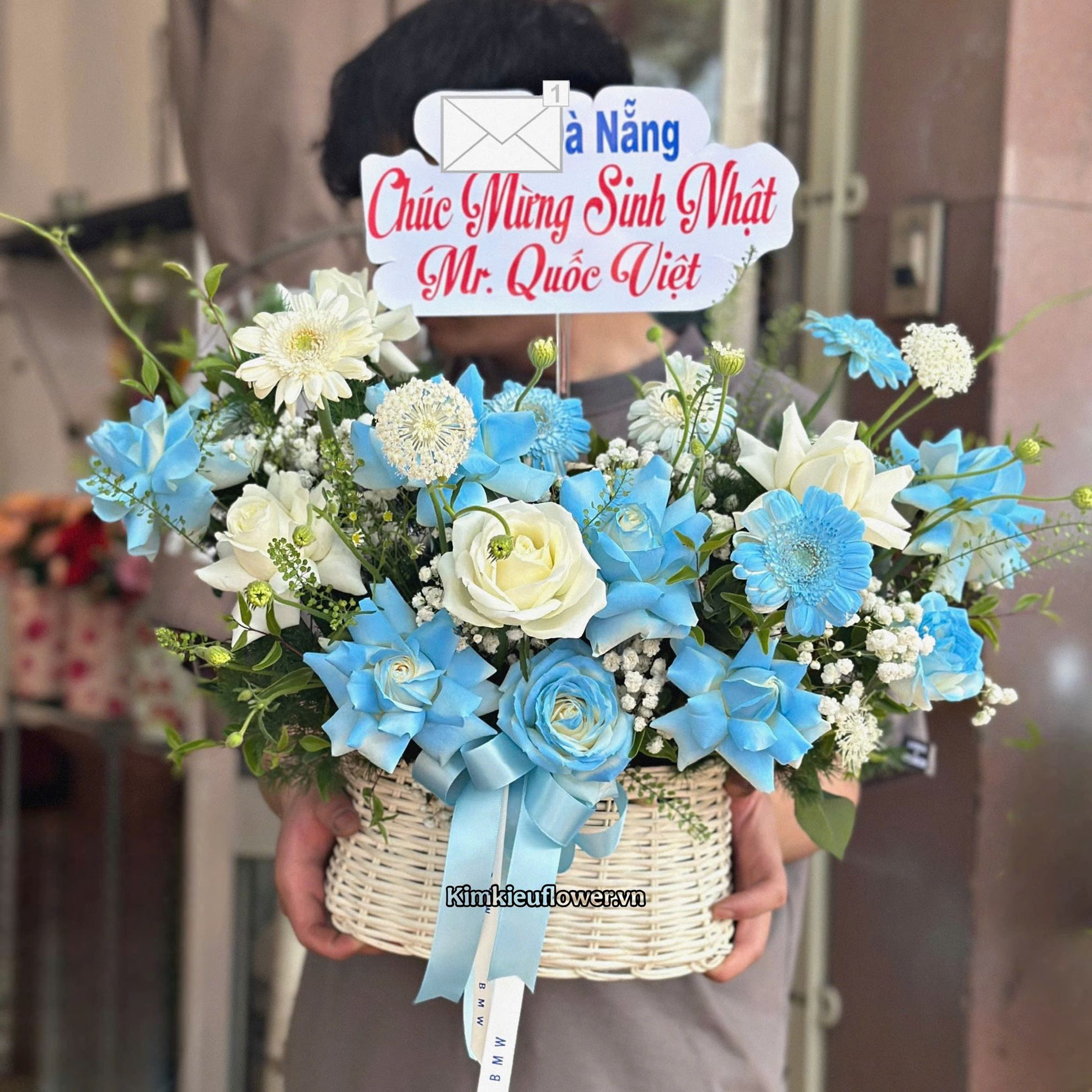 Giỏ hoa chúc mừng tone trắng xanh dương - HG1046