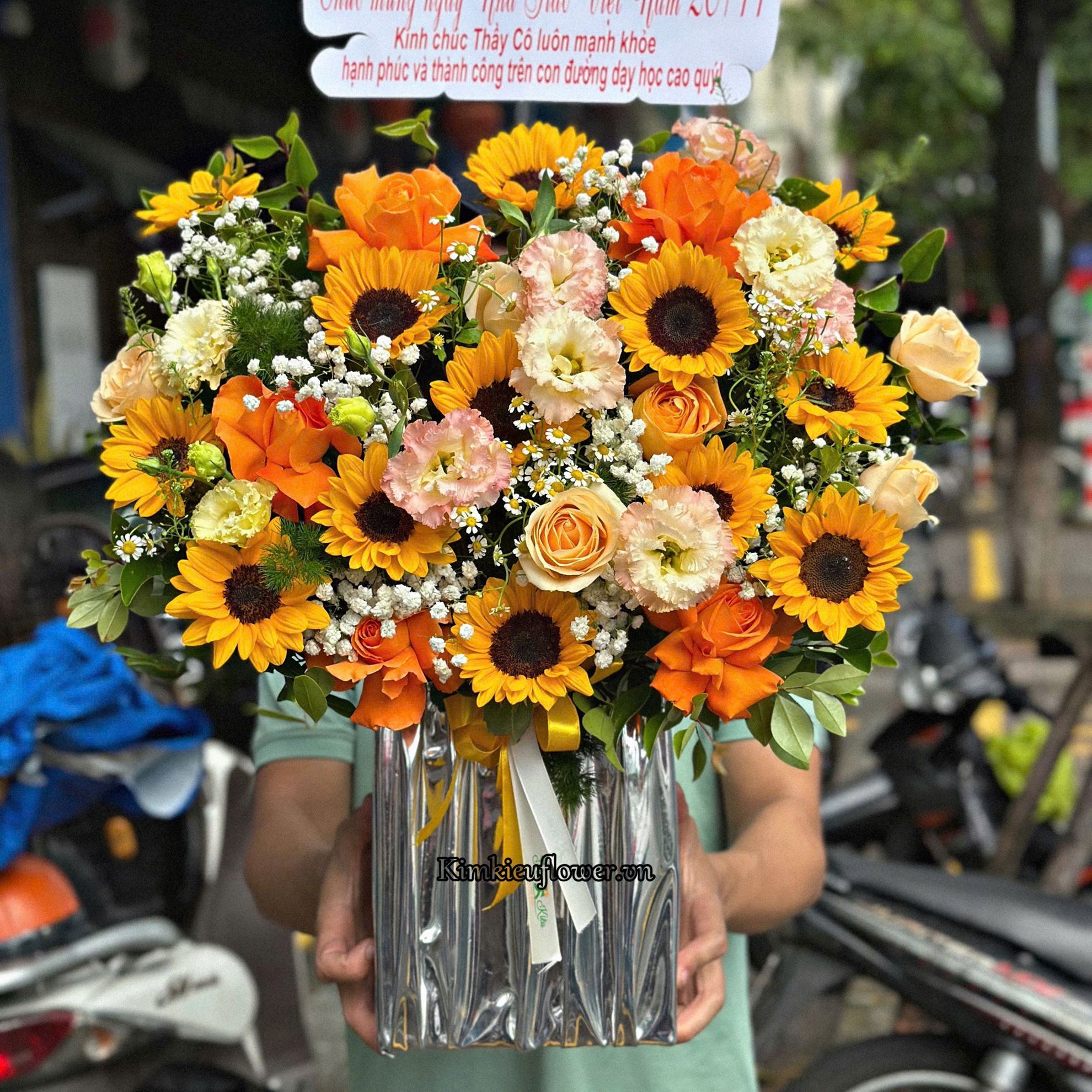 Mẫu HG757 gồm các loại hoa: + 13 hoa hướng dương + 6 hoa hồng cam (5 lận-1 không lận) + 5 hoa hồng mỡ gà + cát tường cà rốt + và các lá phụ khác - Liên hệ KIM KIỀU FLOWER để tư vấn thiết kế mẫu hoa theo yêu cầu bạn nhé!
