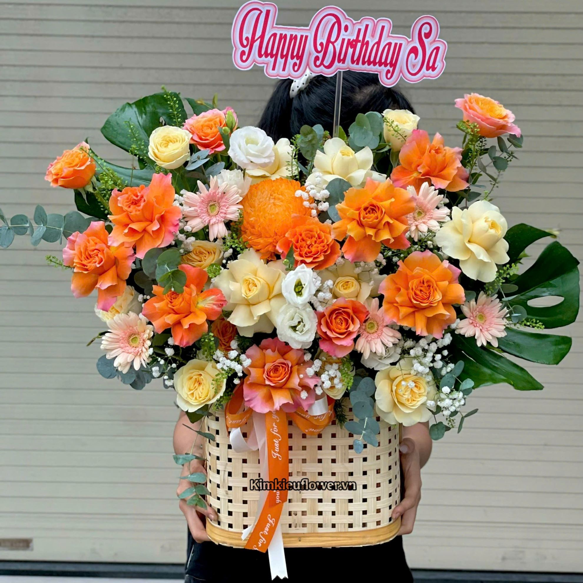 Giỏ hoa chúc mừng tone vàng cam mix cát tường trắng - HG965