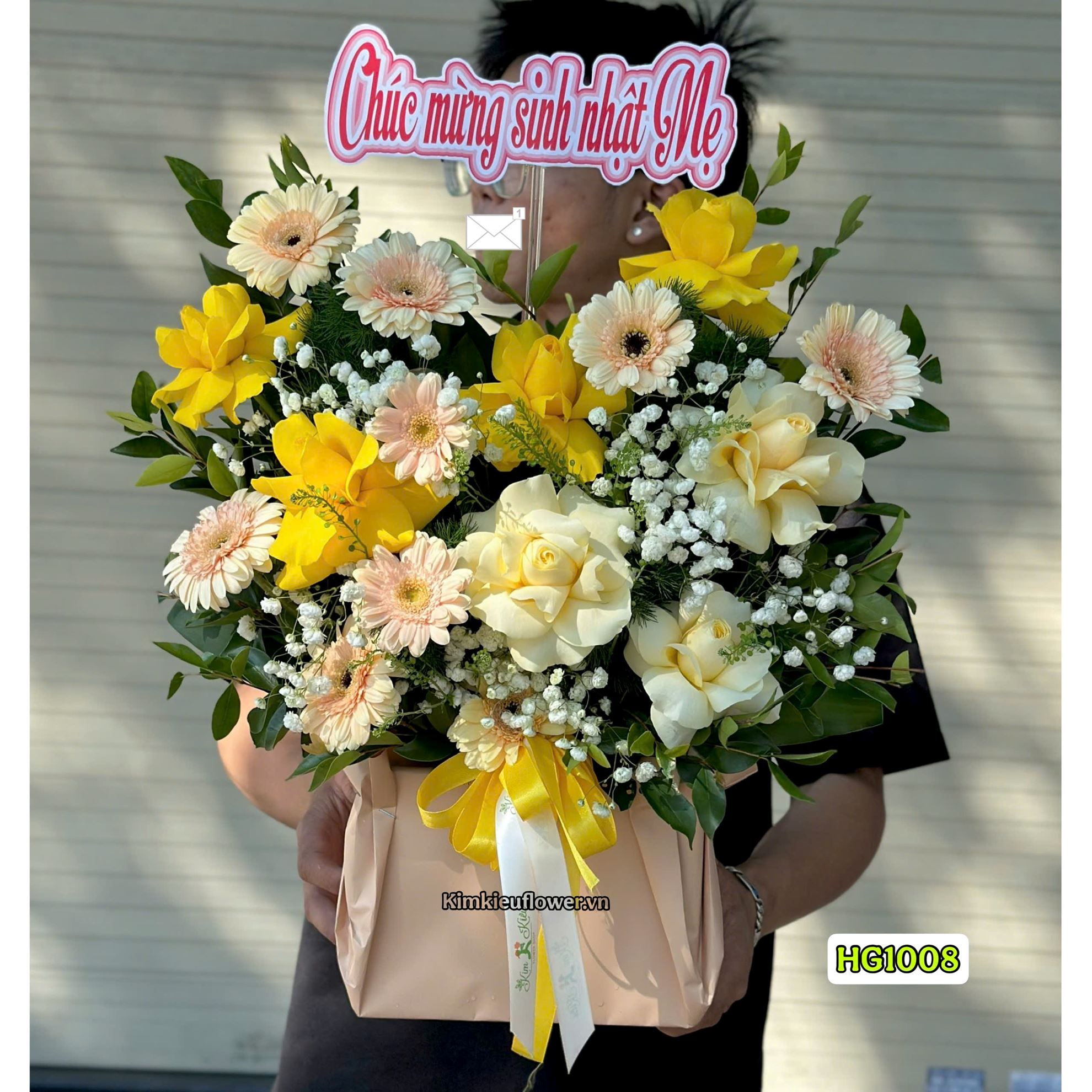 Giỏ hoa chúc mừng tone vàng hoa hồng mix đồng tiền - HG1008
