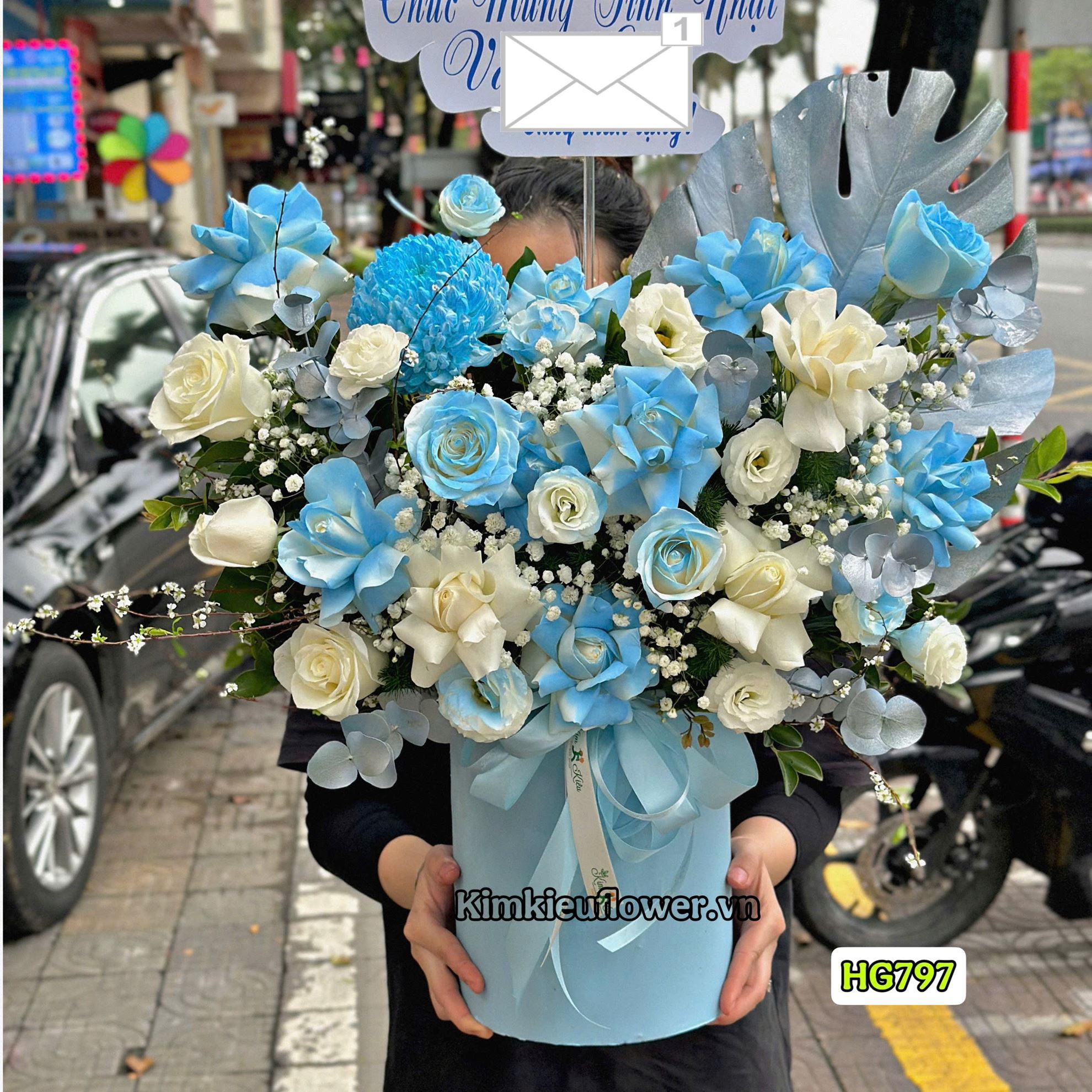Mẫu HG797 gồm các loại hoa: + 1 Cúc mẫu đơn xanh dương + 16 Hoa hồng trắng (10 lận- 6 không lận) + Cát tường trắng + và các lá phụ khác - Liên hệ KIM KIỀU FLOWER để tư vấn thiết kế mẫu hoa theo yêu cầu bạn nhé!