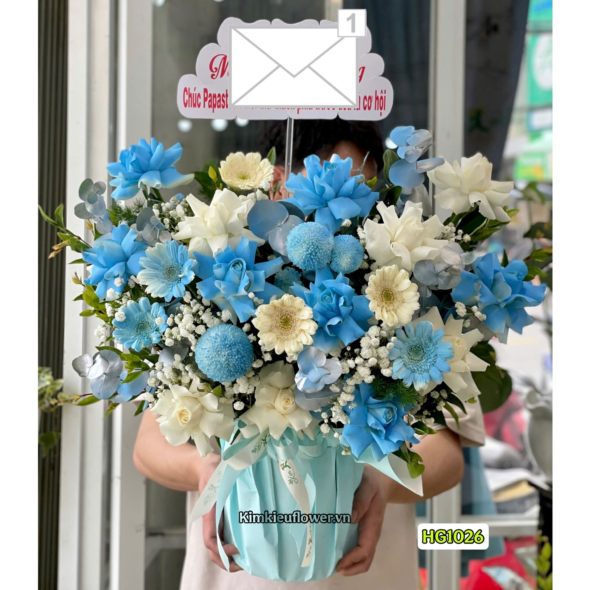 Mẫu HG1026 gồm các loại hoa: + 7 hoa hồng trắng xịt xanh + 6 hoa hồng trắng + 3 đồng tiền nhí trắng + 3 đồng tiền nhí trắng xịt xanh + 2 cúc pingpong xịt xanh + và các lá phụ khác - Liên hệ KIM KIỀU FLOWER để tư vấn thiết kế mẫu hoa theo yêu cầu bạn nhé!