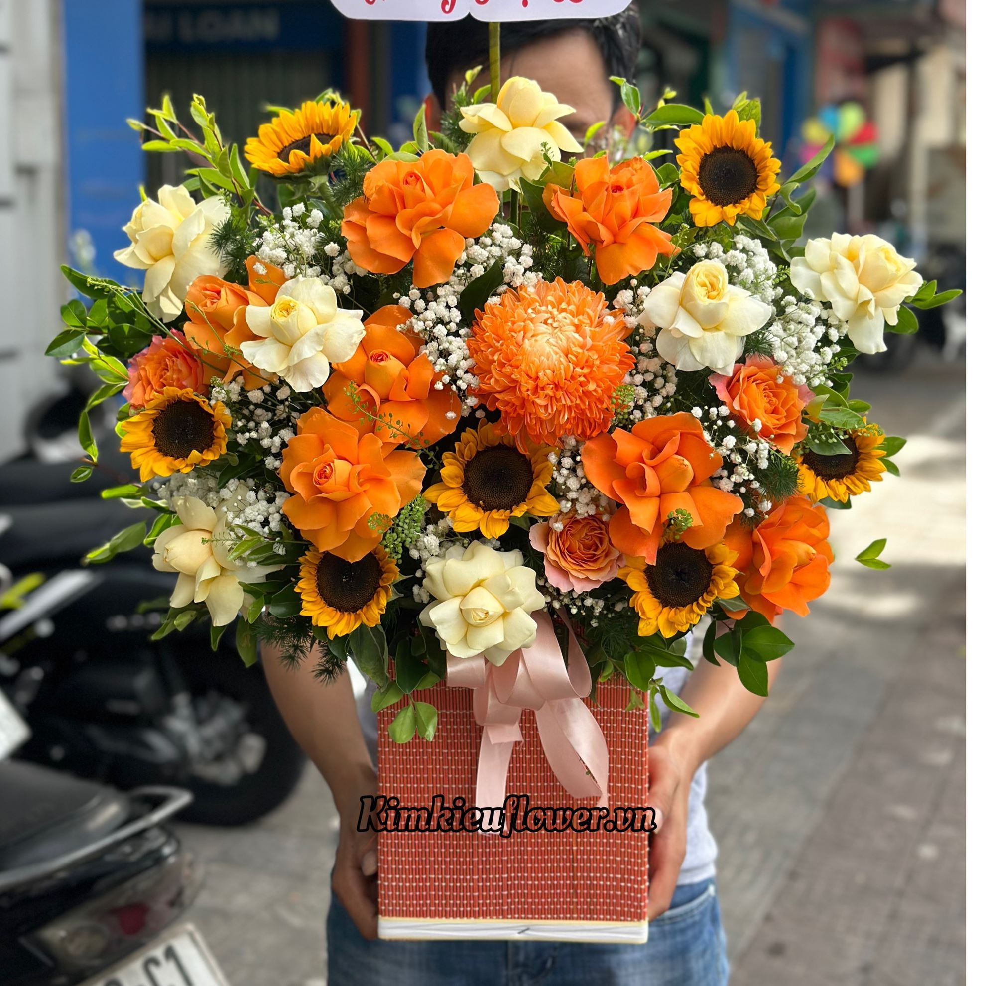 Giỏ hoa HG373 gồm: + cúc mẫu đơn cam + 10 hoa hồng cam ( 7 lận cánh, 3 không lận cánh ) + 7 hoa hồng victor vàng + 8 hoa hướng dương + và các lá phụ khác - Liên hệ KIM KIỀU FLOWER để tư vấn thiết kế mẫu hoa theo yêu cầu bạn nhé!