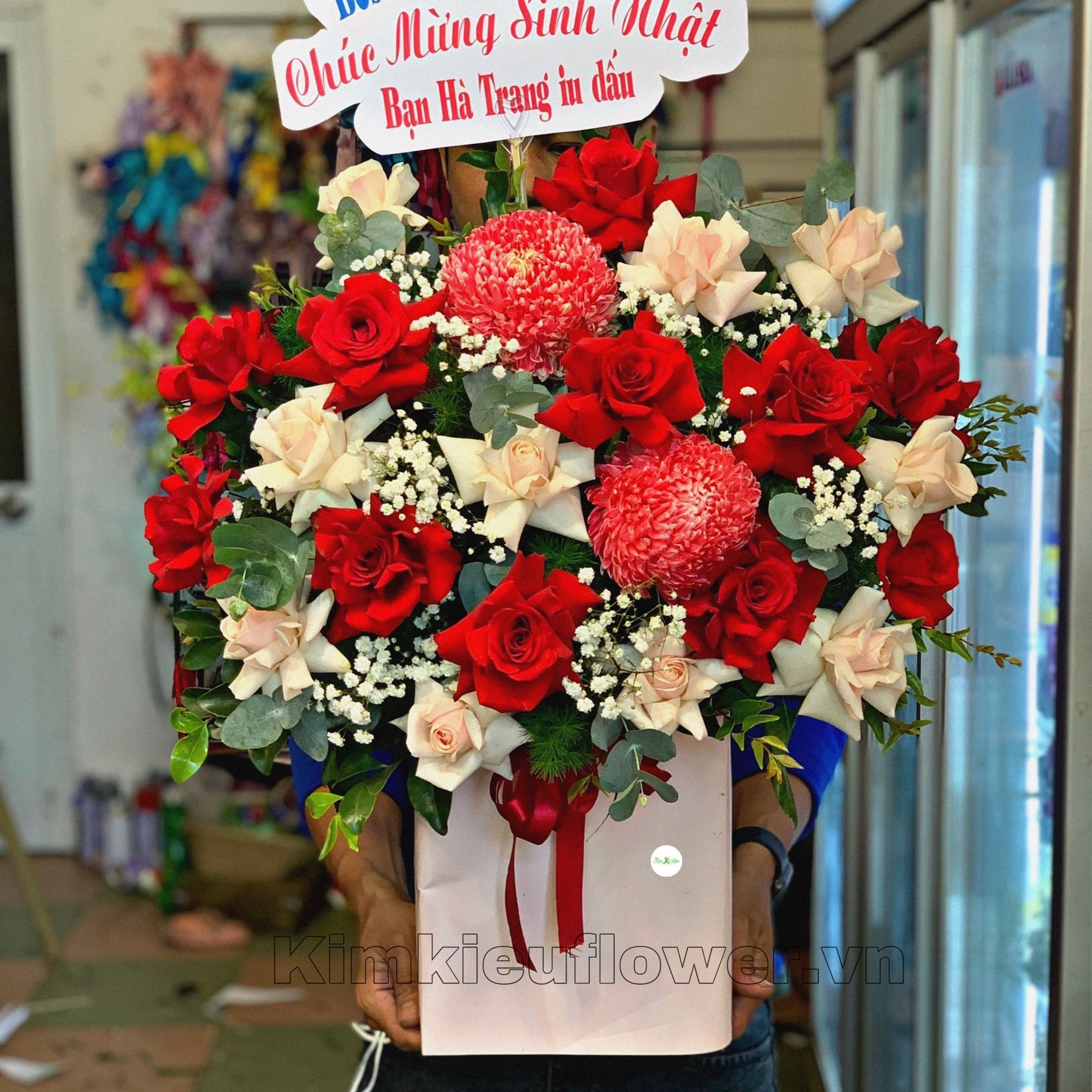 Mẫu HG320 gồm các loại hoa : + 2 cúc mẫu đơn đỏ + 11 hoa hồng đỏ lận + 10 hoa hồng kem lận cánh + và các hoa,lá phụ khác - Liên hệ KIM KIỀU FLOWER để tư vấn thiết kế mẫu hoa theo yêu cầu bạn nhé!