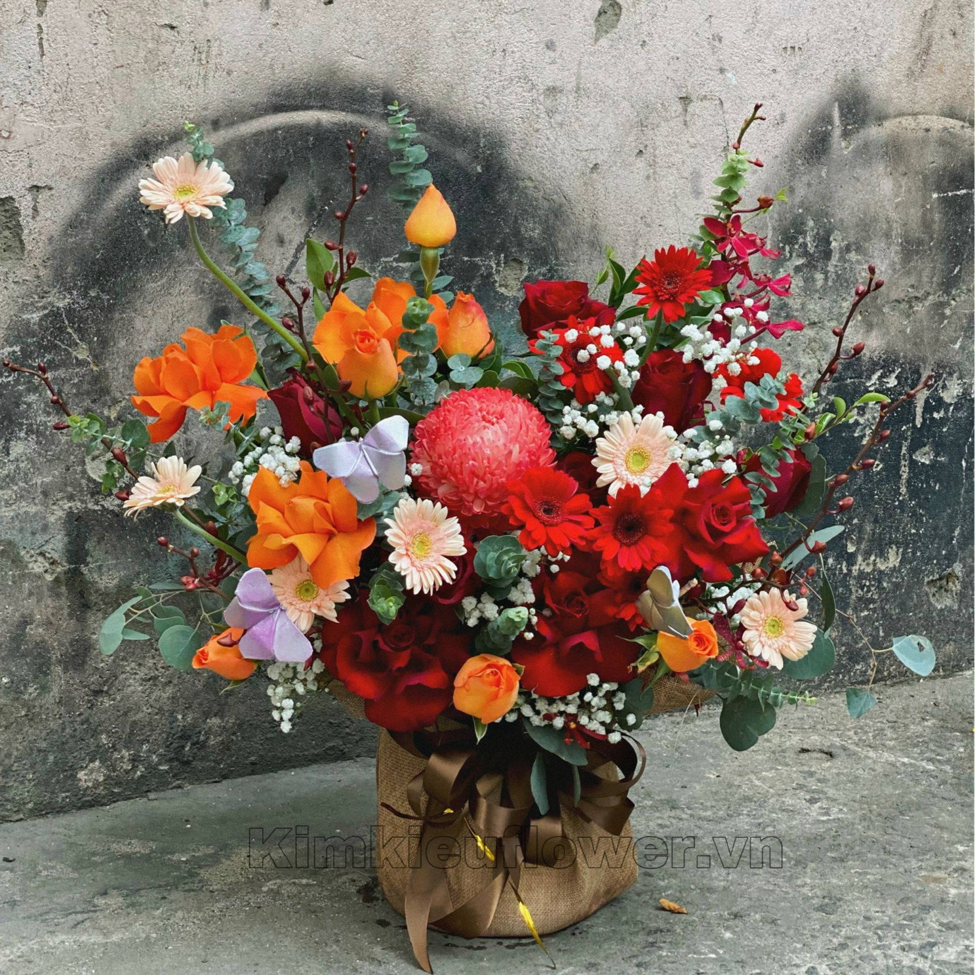 Mẫu HG353 gồm các loại hoa: + 1 cúc mẫu đơn hàng nhập khẩu + hoa hồng cam + hoa hồng đỏ + đồng tiền nhí + lan đỏ + và các lá phụ khác - Liên hệ KIM KIỀU FLOWER để tư vấn thiết kế mẫu hoa theo yêu cầu bạn nhé!