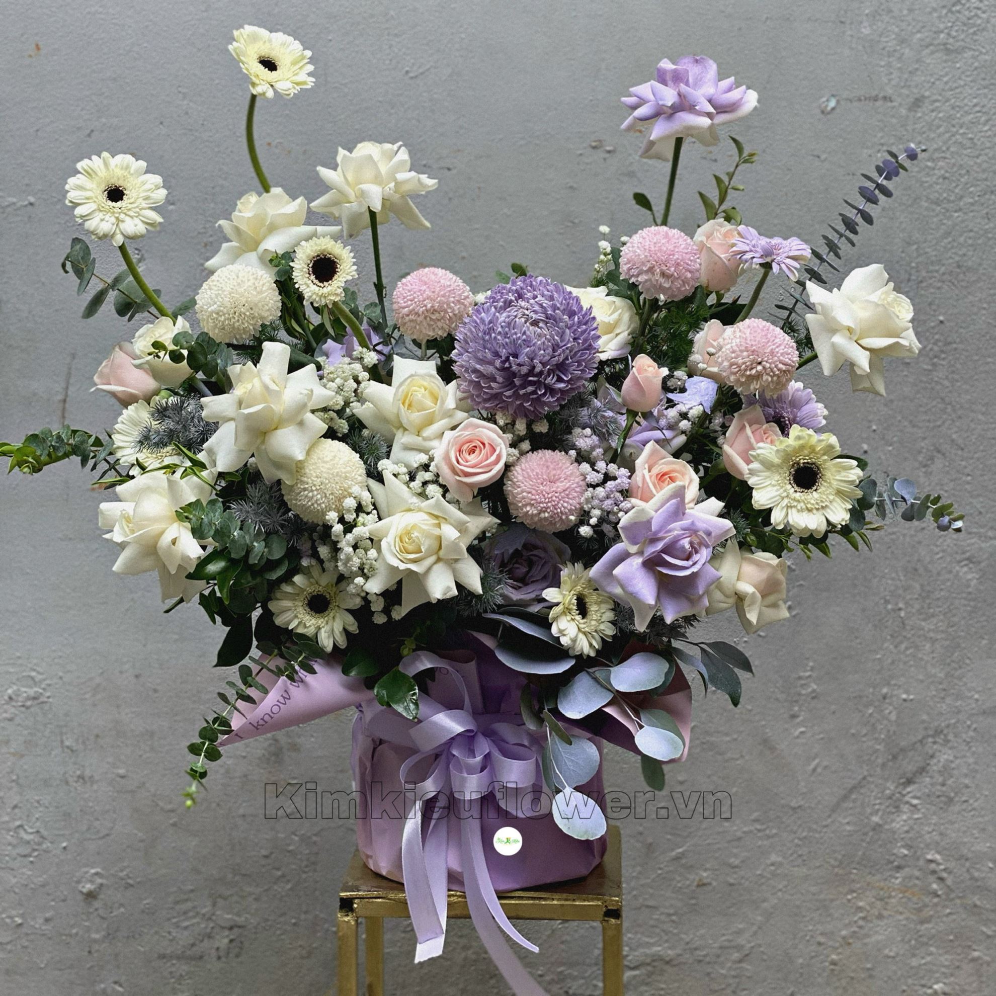 Mẫu HG352 gồm các loại hoa: + hoa hồng trắng xịt màu tím + hoa hồng trắng + hoa hồng kem + 1 cúc mẫu đơn tím + pingpong + đồng tiền nhí + và các lá phụ khác - Liên hệ KIM KIỀU FLOWER để tư vấn thiết kế mẫu hoa theo yêu cầu bạn nhé!