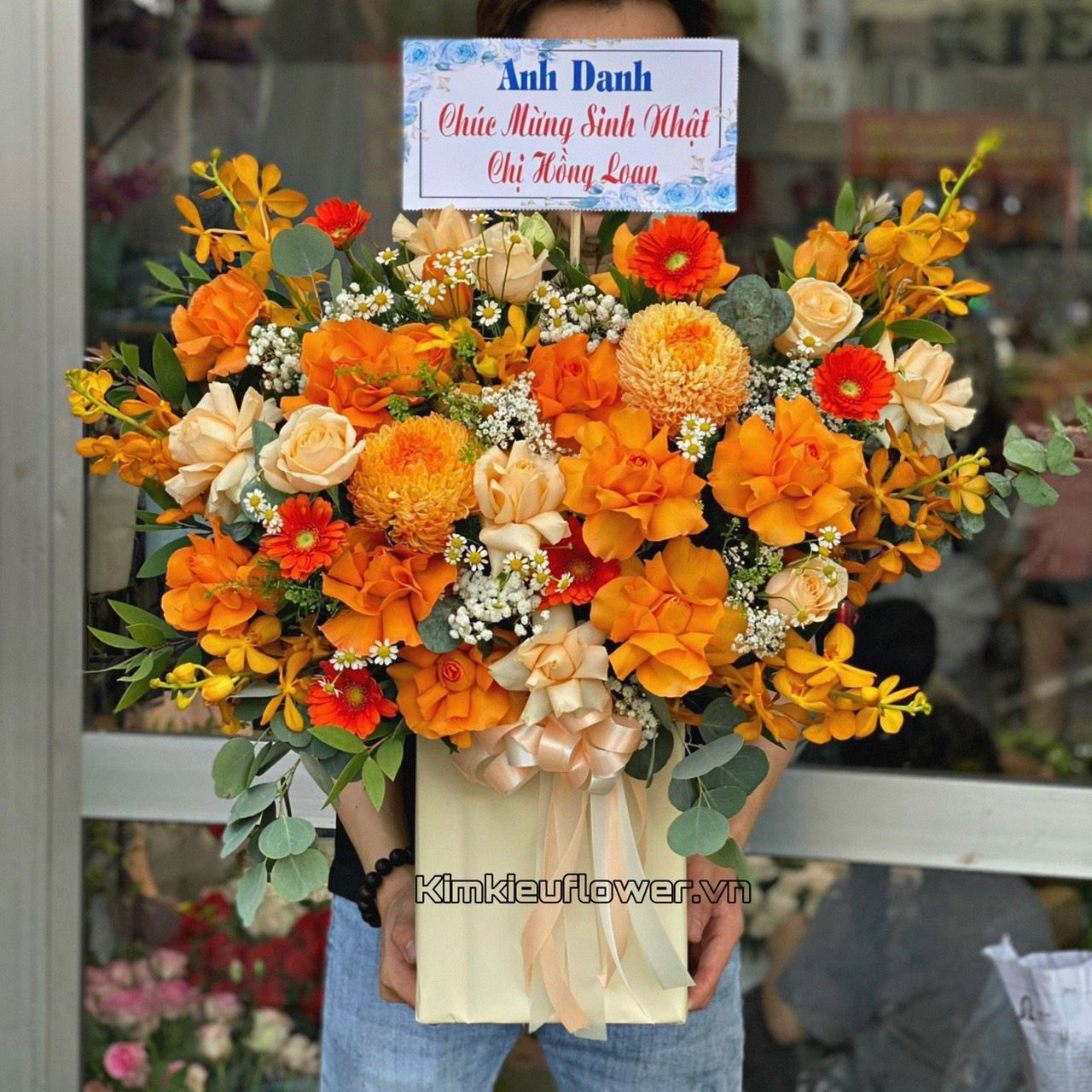 Mẫu HG561 gồm các loại hoa: + 2 cúc mẫu đơn cam + 6 lan vàng + 10 hồng cam lận cánh - 3 không lận + 5 hồng mỡ gà lận cánh - 4 không lận + 6 đồng tiền nhí + và các lá phụ khác - Liên hệ KIM KIỀU FLOWER để tư vấn thiết kế mẫu hoa theo yêu cầu bạn nhé!