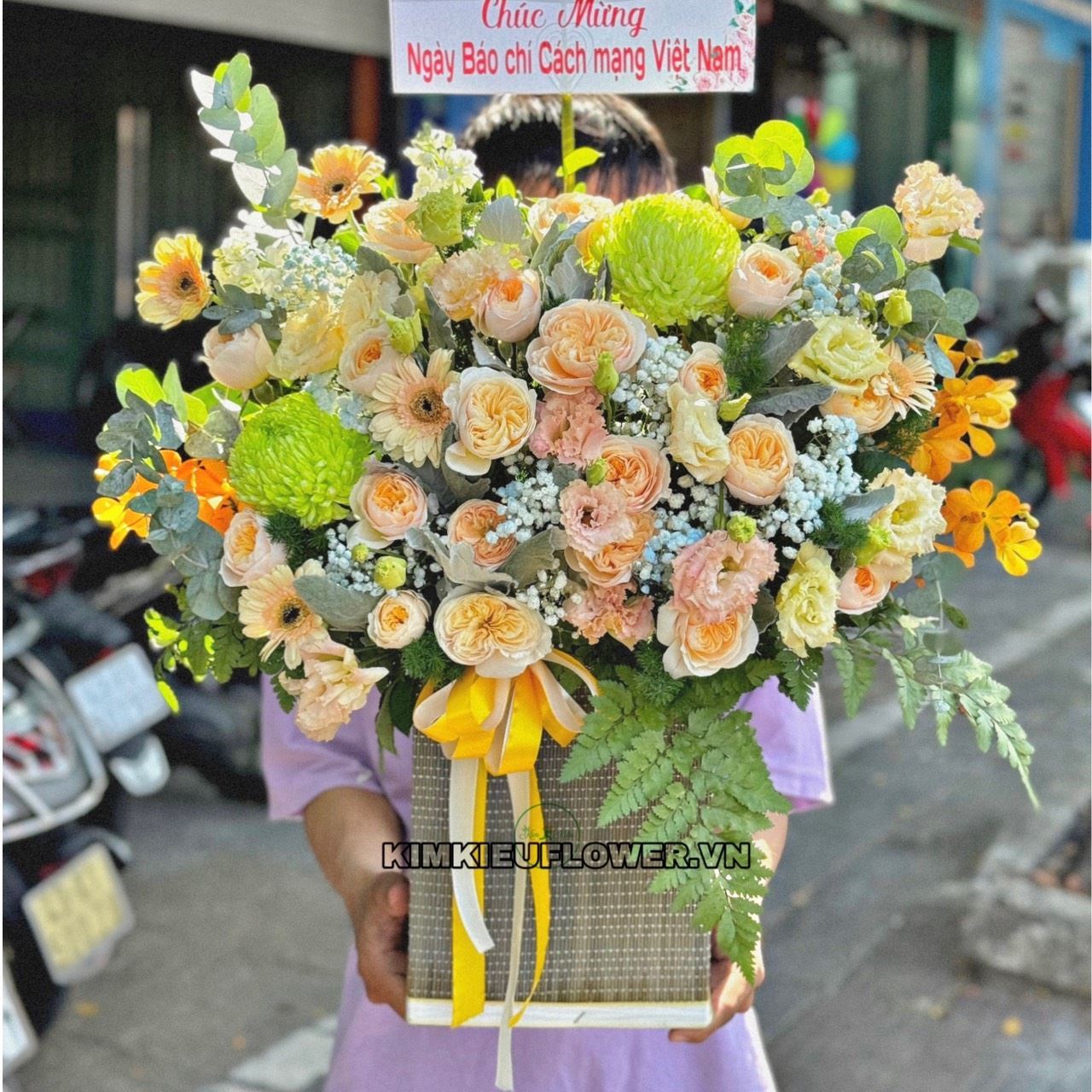 Giỏ hoa HG716 gồm: + 2 cúc mẫu đơn xanh lá + 22 hoa hồng juliet + 2 phi yến + cát tường + 5 hoa đồng tiền trứng + 3 lan vàng + và các lá phụ khác - Liên hệ KIM KIỀU FLOWER để tư vấn thiết kế mẫu hoa theo yêu cầu bạn nhé!