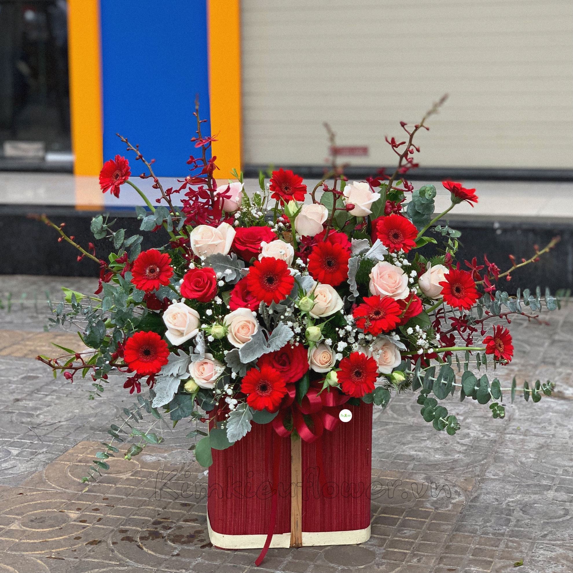 Mẫu HG196 gồm các loại hoa: + Hoa hồng kem + hoa đồng tiền nhí đỏ + hoa hồng đỏ + lan nhện + và các hoa,lá phụ khác- Liên hệ KIM KIỀU FLOWER để tư vấn thiết kế mẫu hoa theo yêu cầu bạn nhé!