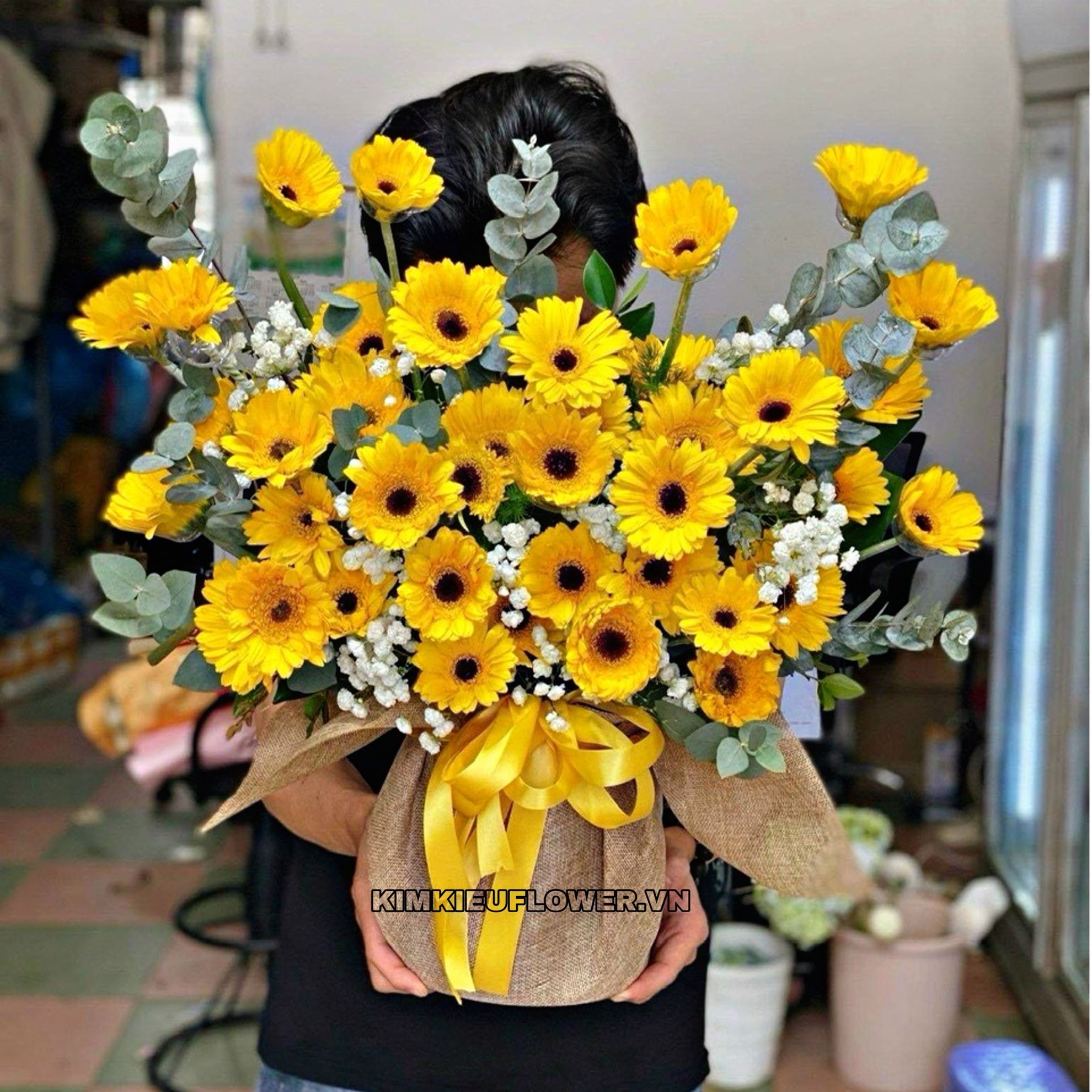 Giỏ hoa HG673 gồm: + 37 Hoa đồng tiền vàng + và các lá phụ khác - Liên hệ KIM KIỀU FLOWER để tư vấn thiết kế mẫu hoa theo yêu cầu bạn nhé!