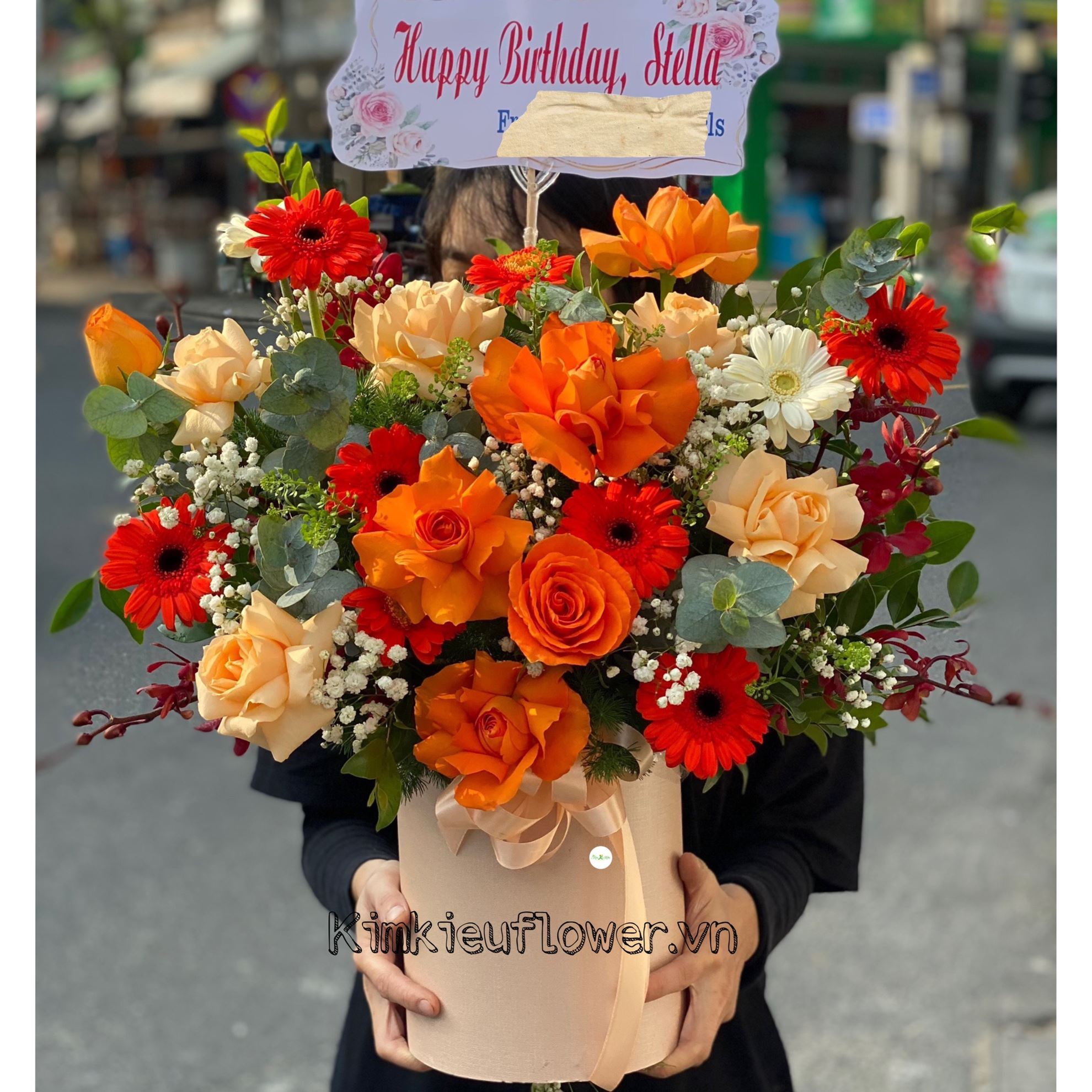 Mẫu HG399 gồm các loại hoa: + 6 hoa hồng cam ( 4 lận, 2 không lận) + 5 hoa hồng mỡ gà lận cánh + 8 đồng tiền cam, 2 đồng tiền trắng + 6 lan nhện đỏ + và các lá phụ khác - Liên hệ KIM KIỀU FLOWER để tư vấn thiết kế mẫu hoa theo yêu cầu bạn nhé!