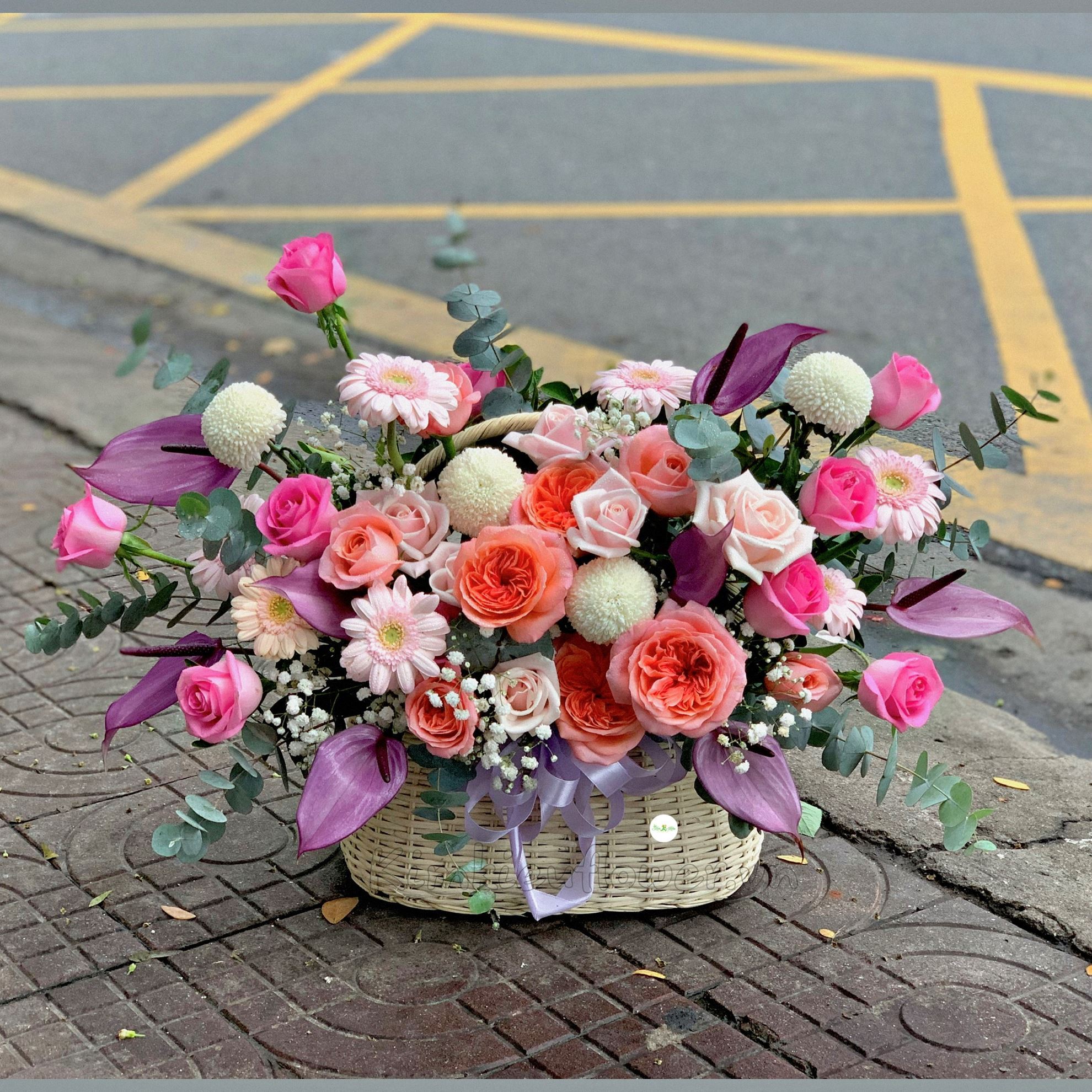giỏ hoa hồng cam london, hồng môn tím - HG271