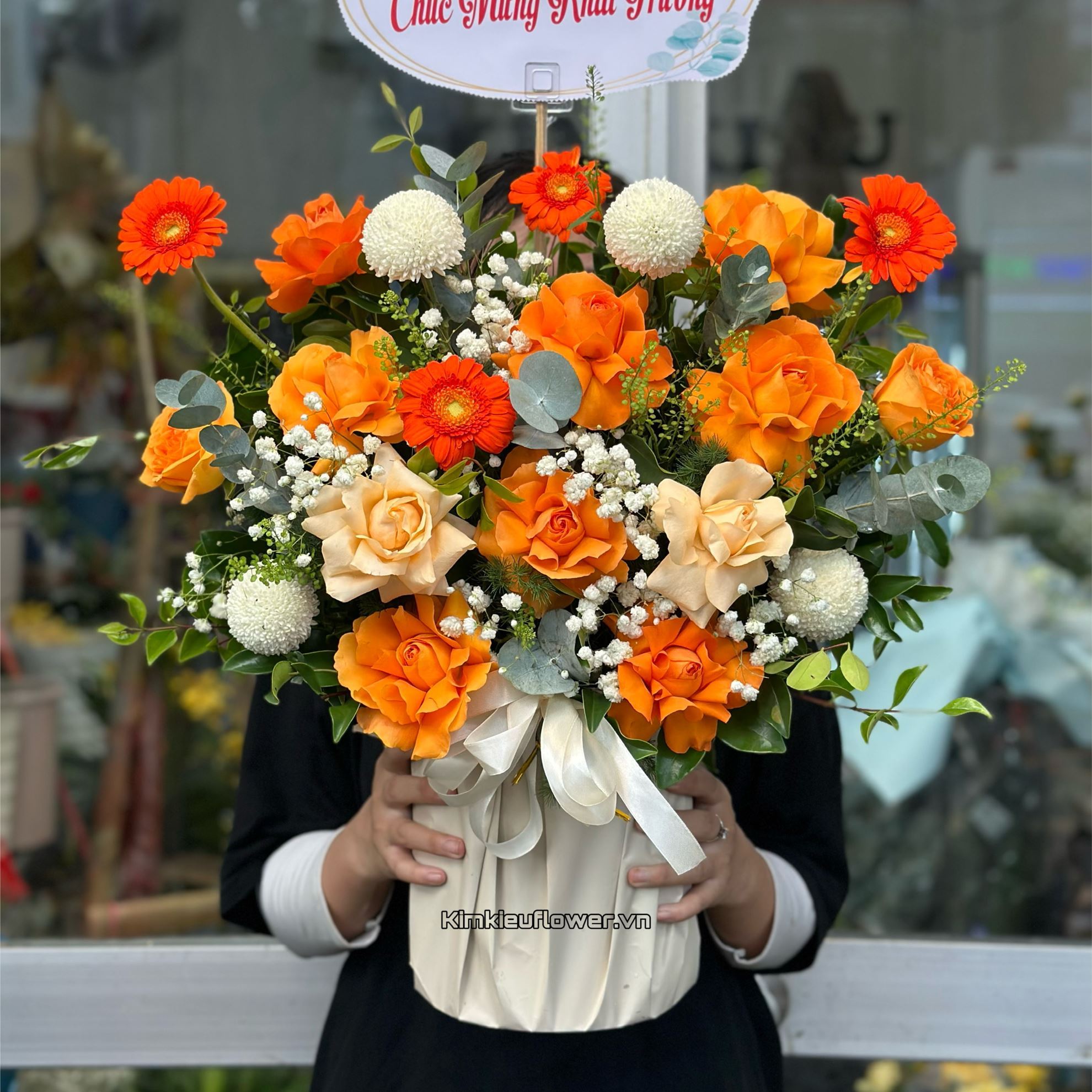 Mẫu HG616 gồm các loại hoa : + 10 hoa hồng cam quốc vương ( 8 lận - 2 không lận ) + 4 hoa hồng mỡ gà lận cánh + 4 pingpong trắng + 4 đồng tiền cam + và các lá phụ khác - Liên hệ KIM KIỀU FLOWER để tư vấn thiết kế mẫu hoa theo yêu cầu bạn nhé!
