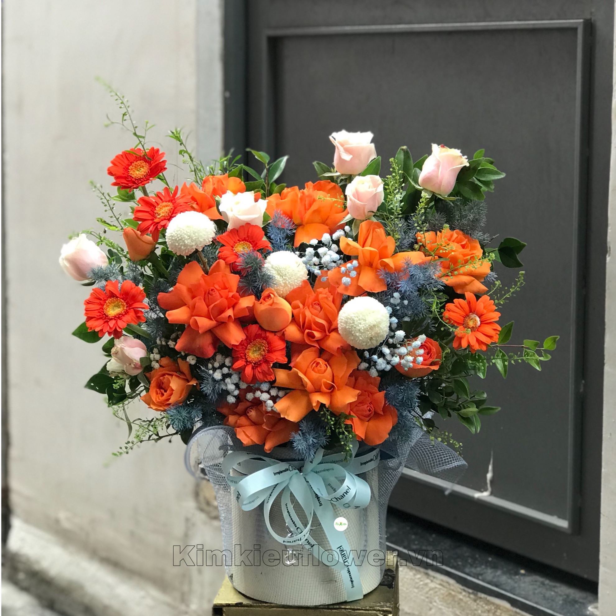 Mẫu HG370 gồm các loại hoa: + hoa hồng cam + hoa hồng kem + pingpong trắng + đồng tiền nhí + và các lá phụ khác - Liên hệ KIM KIỀU FLOWER để tư vấn thiết kế mẫu hoa theo yêu cầu bạn nhé!