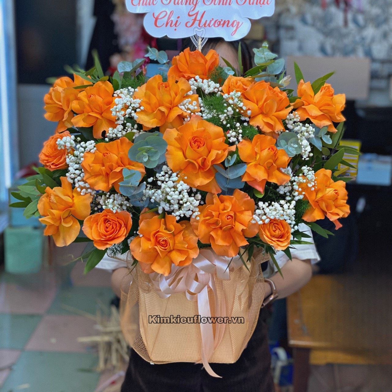Mẫu HG584 gồm các loại hoa: + 17 hoa hồng cam quốc vương ( 13 lận, 4 không lận ) + và các lá phụ khác - Liên hệ KIM KIỀU FLOWER để tư vấn thiết kế mẫu hoa theo yêu cầu bạn nhé!