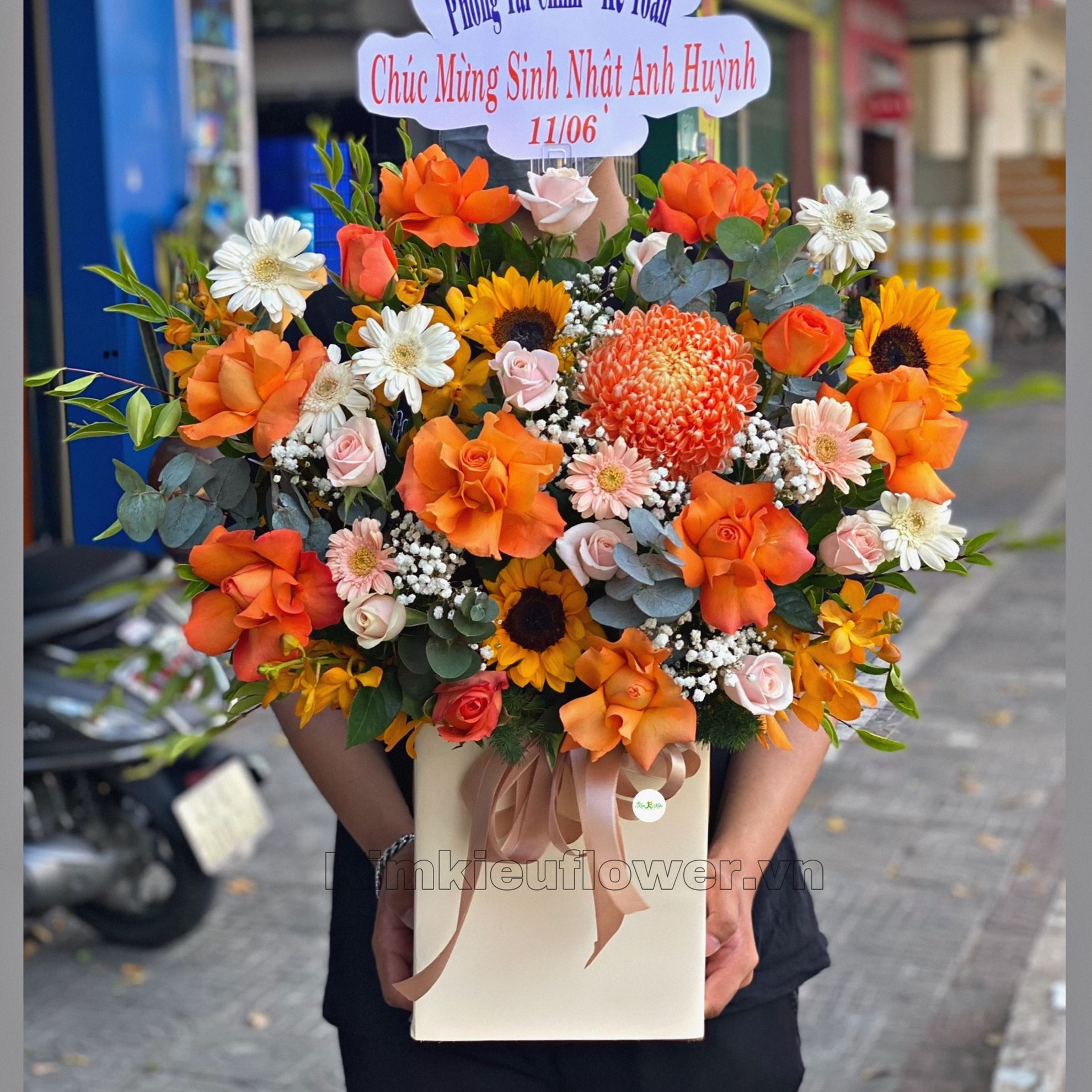 Mẫu HG341 gồm các loại hoa: + hoa hồng cam quốc vương + hoa hồng kem + cúc mẫu đơn + đồng tiền nhí + hướng dương + và các lá phụ khác - Liên hệ KIM KIỀU FLOWER để tư vấn thiết kế mẫu hoa theo yêu cầu bạn nhé!