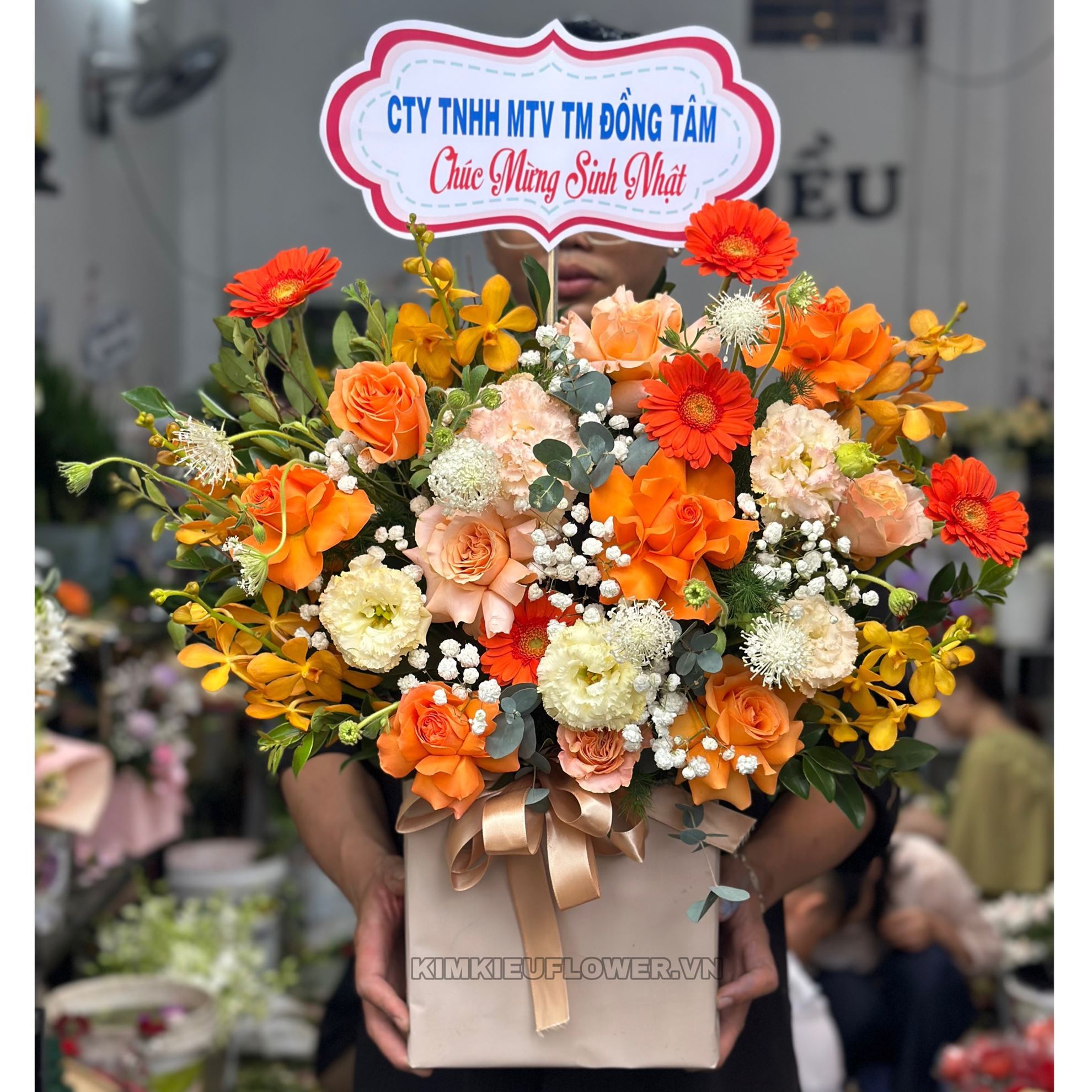 Giỏ hoa HG668 gồm: + 6 Hoa hồng cam ( 5 lận - 1 không lận ) + 4 Hoa hồng shimmer ( 2 lận - 2 không lận ) + 5 Đồng tiền cam + Cát tường cà rốt + 5 Lan vàng + Thuý châu + và các lá phụ khác - Liên hệ KIM KIỀU FLOWER để tư vấn thiết kế mẫu hoa theo yêu cầu bạn nhé!