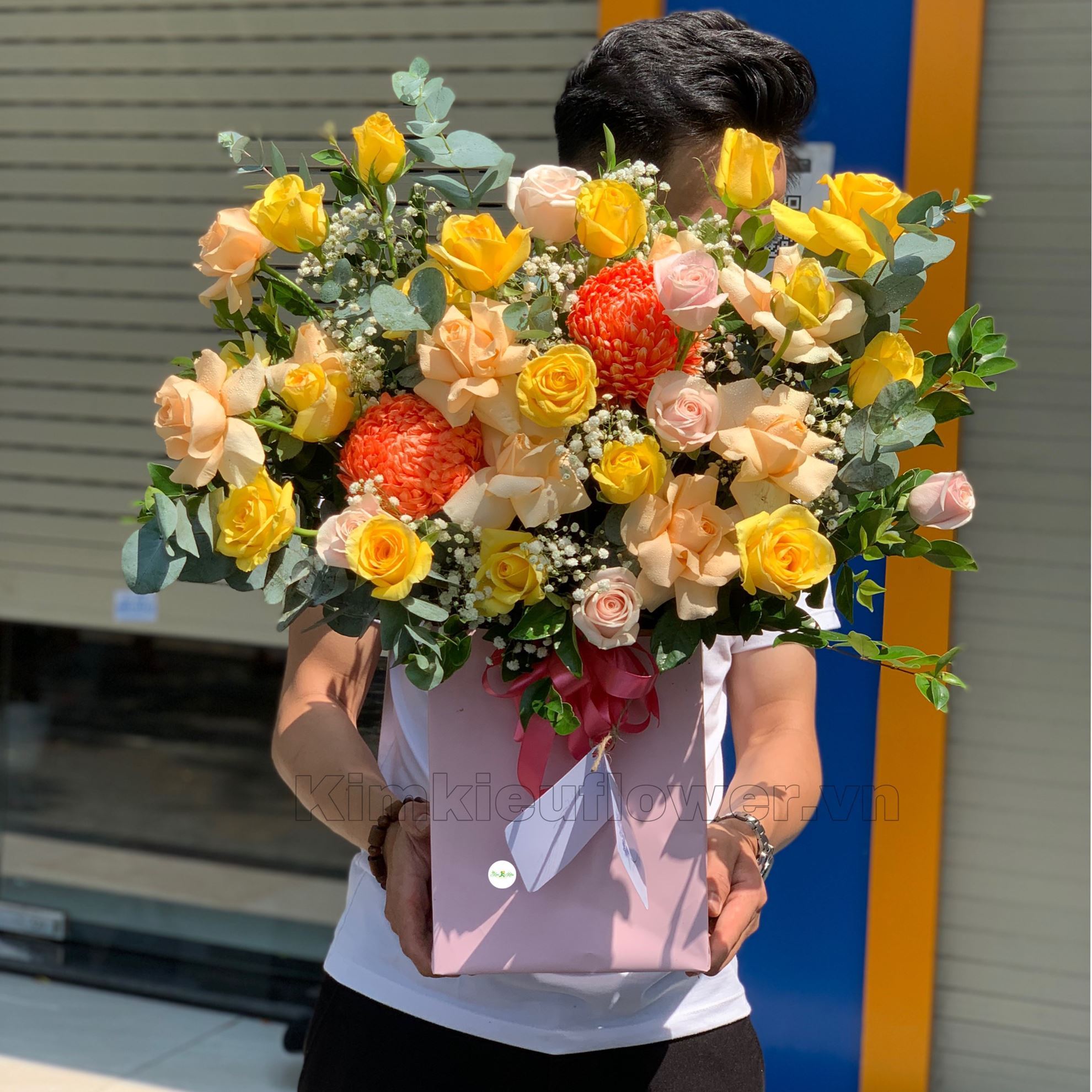 Mẫu HG306 gồm các loại hoa: + 16 hoa hồng vàng + 9 hoa hồng mỡ gà lận cánh + 6 hoa hồng kem + 2 cúc mẫu đơn + và các hoa,lá phụ khác - Liên hệ KIM KIỀU FLOWER để tư vấn thiết kế mẫu hoa theo yêu cầu bạn nhé!