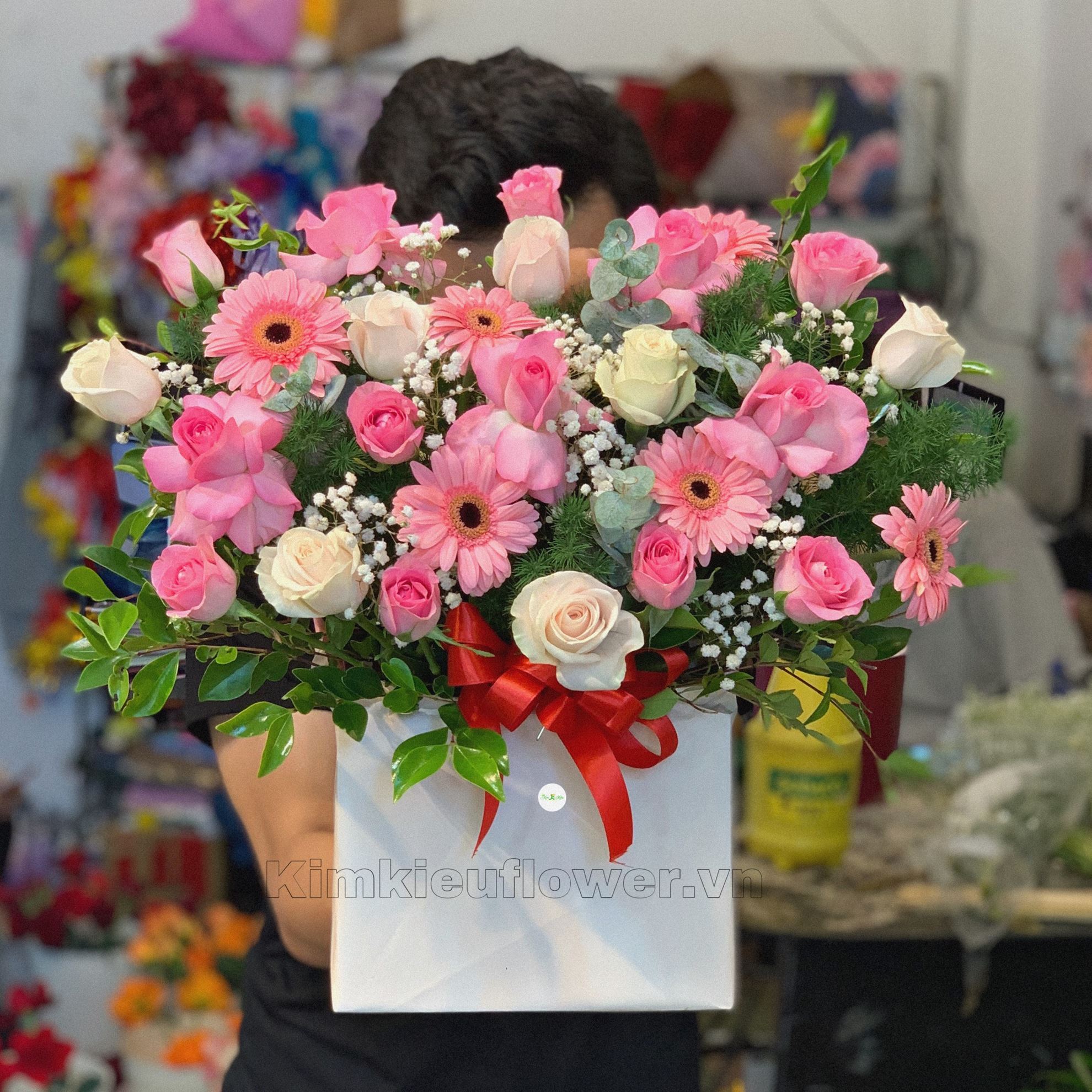 Mẫu HG277 gồm các loại hoa: + 13 hoa hồng dâu ( 5 lận, 8 không lận) + 6 hoa đồng tiền nhí hồng + 7 hoa hồng kem + và các lá phụ khác - Liên hệ KIM KIỀU FLOWER để tư vấn thiết kế mẫu hoa theo yêu cầu bạn nhé!