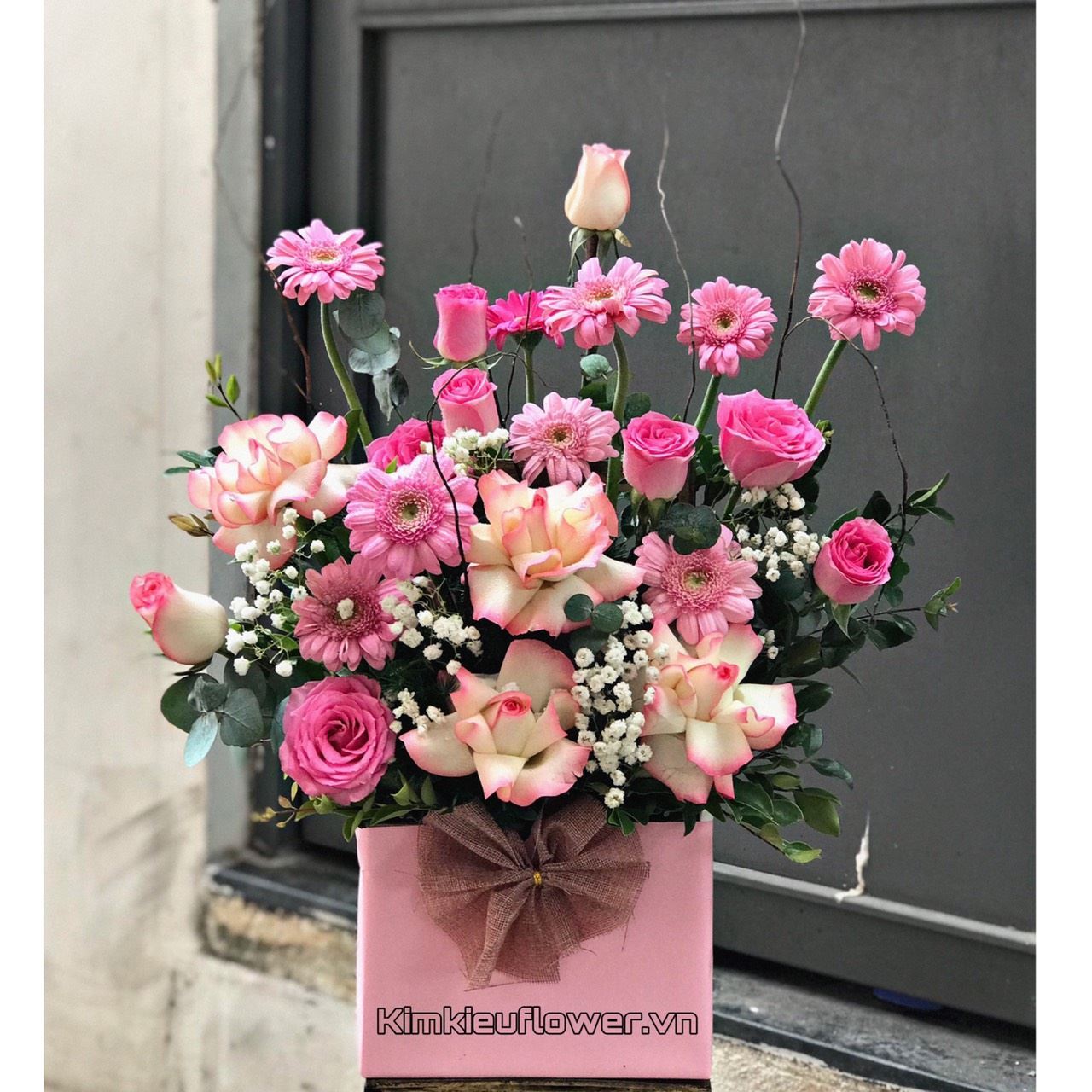 Mẫu hg524 gồm các loại hoa: + 6 hoa hồng hỷ viền (4 lận - 2 không lận) + 7 hoa hồng dâu + 8 đồng tiền nhí + và các lá phụ khác - Liên hệ KIM KIỀU FLOWER để tư vấn thiết kế mẫu hoa theo yêu cầu bạn nhé!